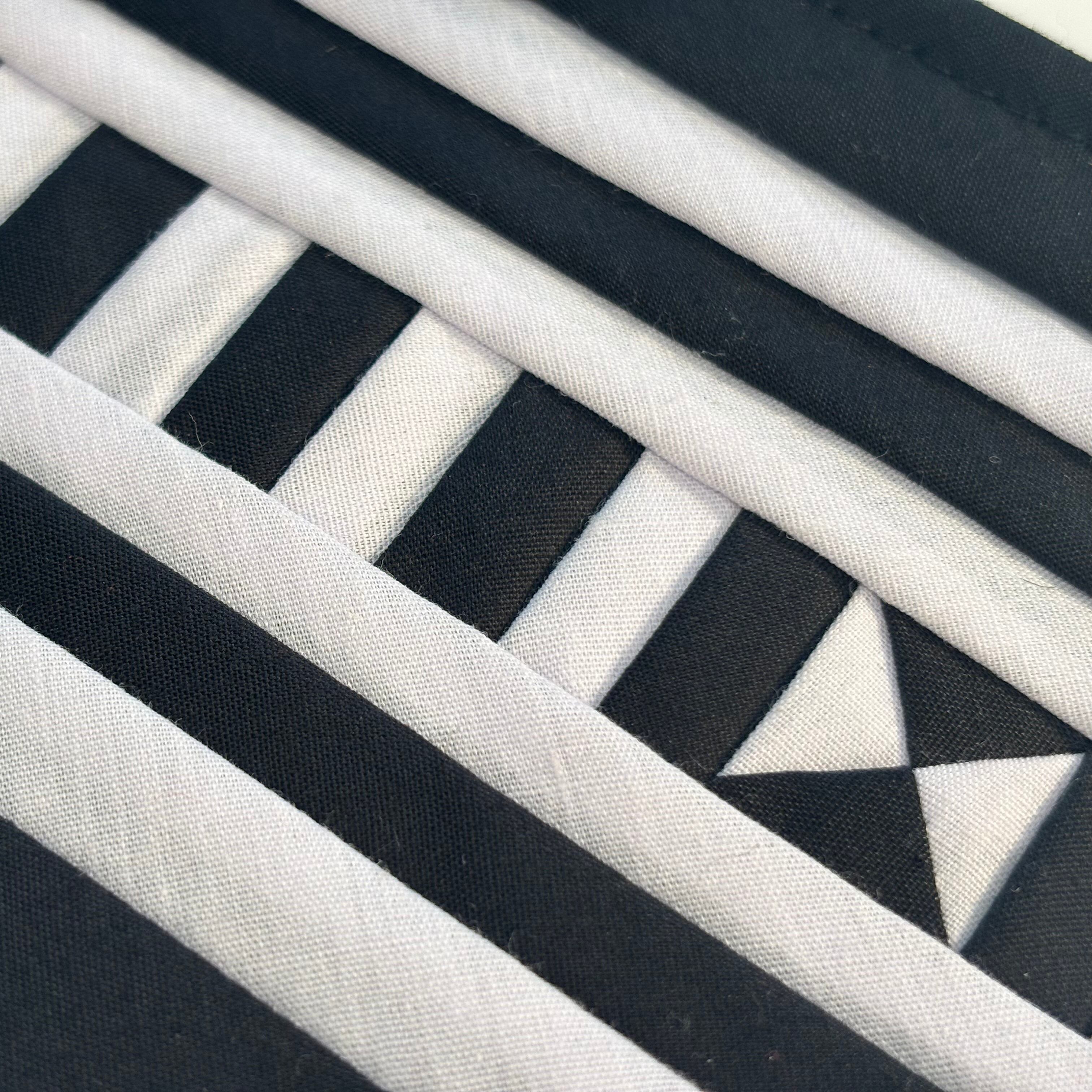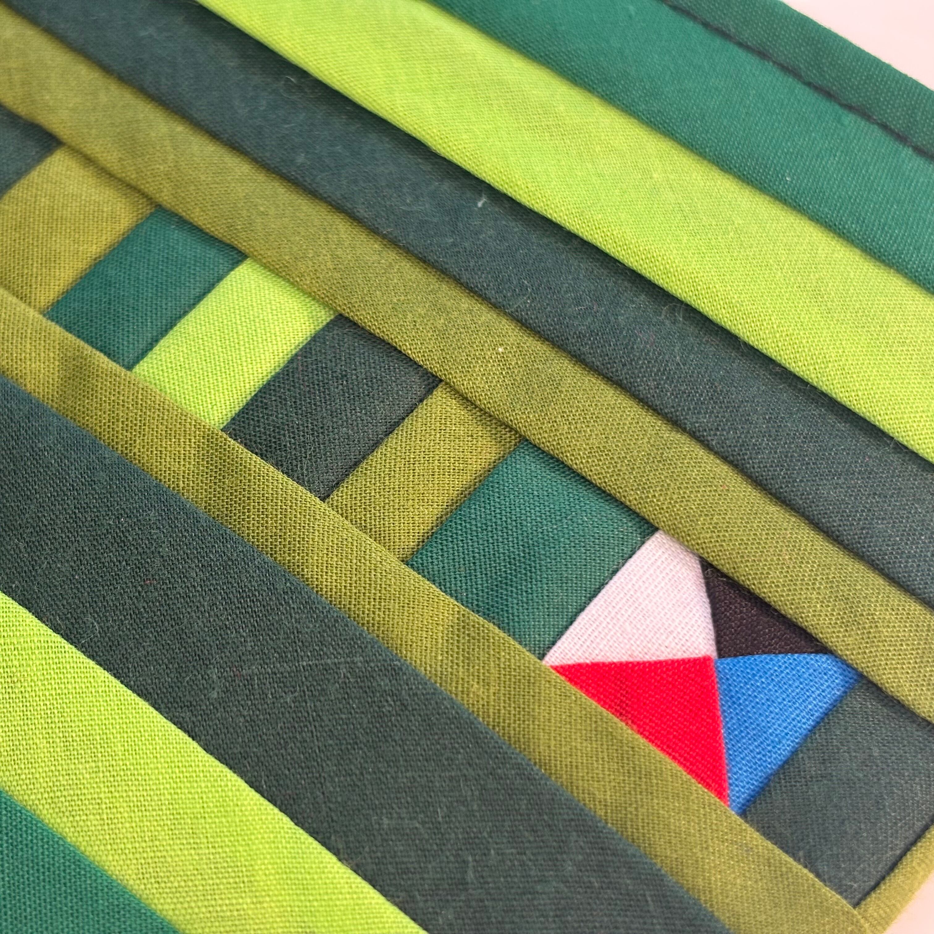 三角形や四角形、縞模様などの幾何学的な形に切られた布を、色のバランスを考えながら手で縫い重ねていくことで、カラフルで奥行きのある模様が生まれます。