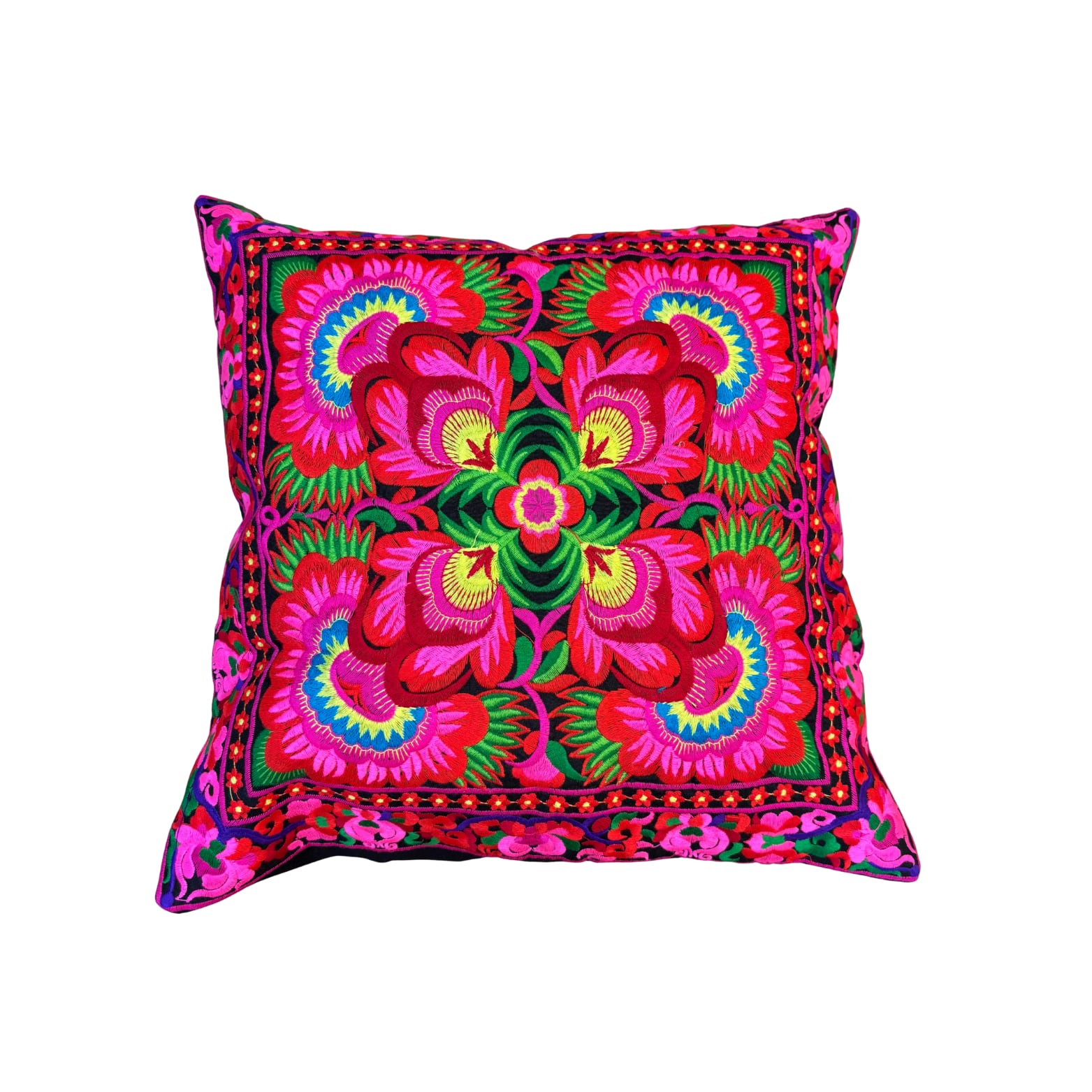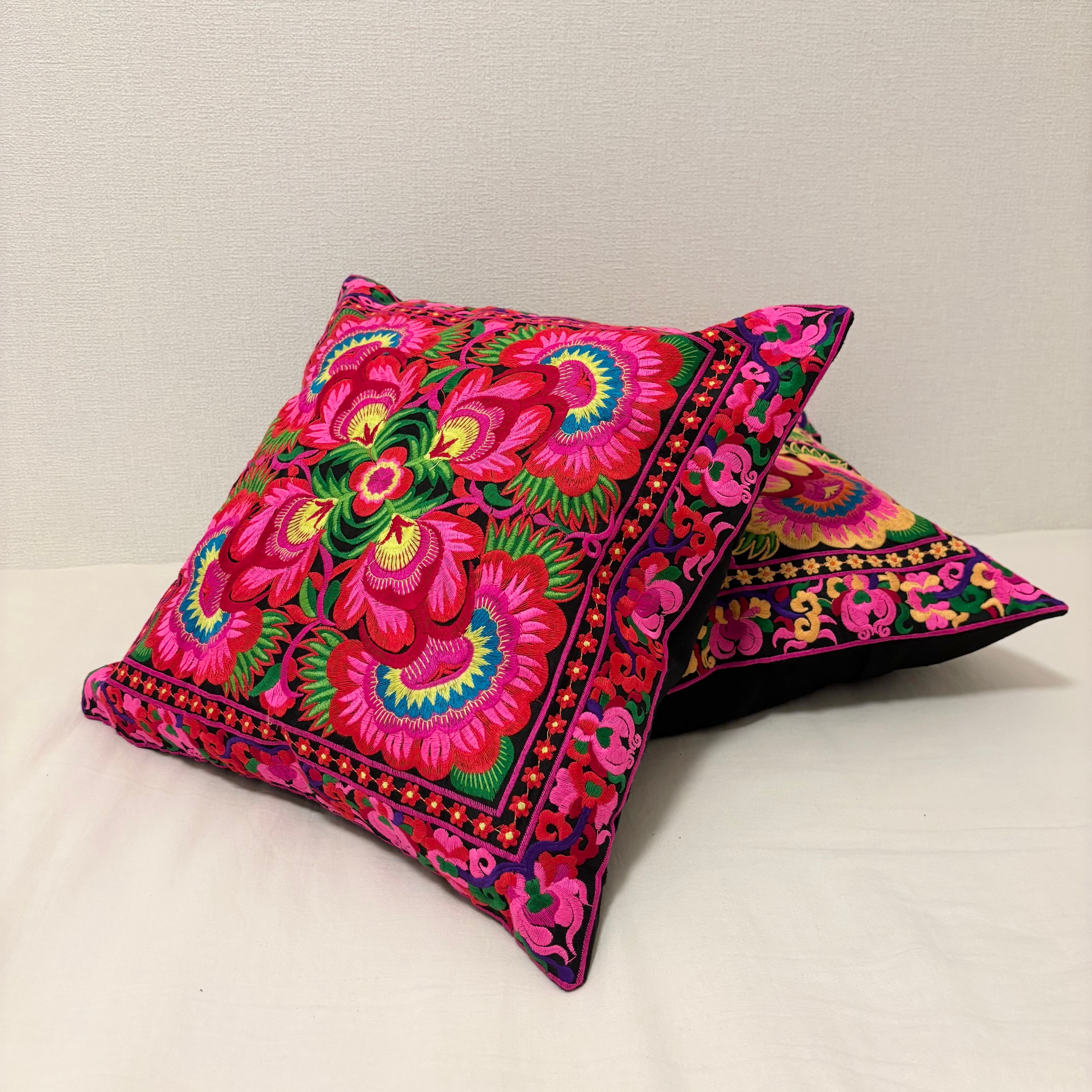 タイ北部に暮らすHmong(モン族)の伝統的な花柄刺繍を贅沢にあしらったクッションカバーです。
