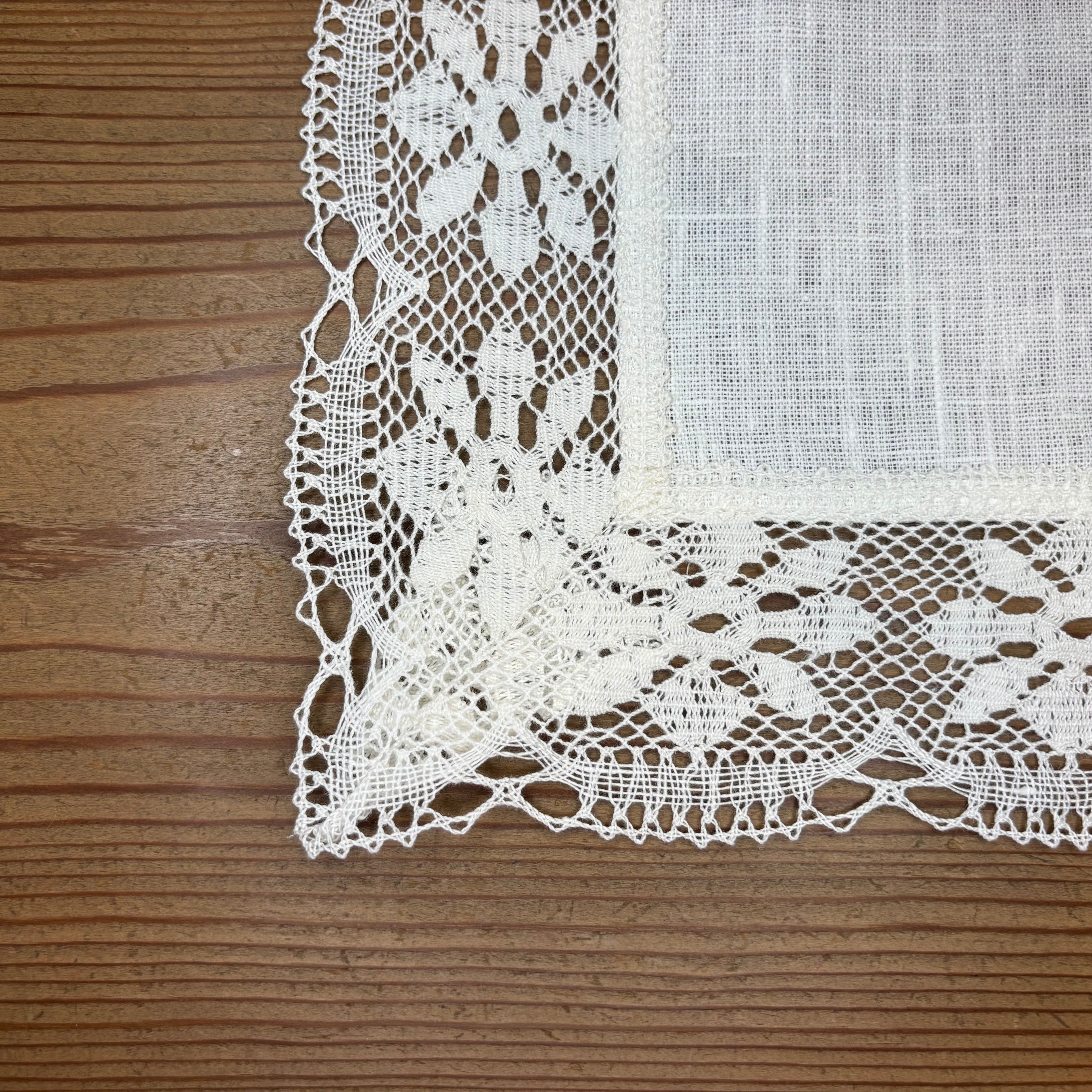 縁をぐるりと囲む花柄レースが、全体にやさしい表情を添えています。