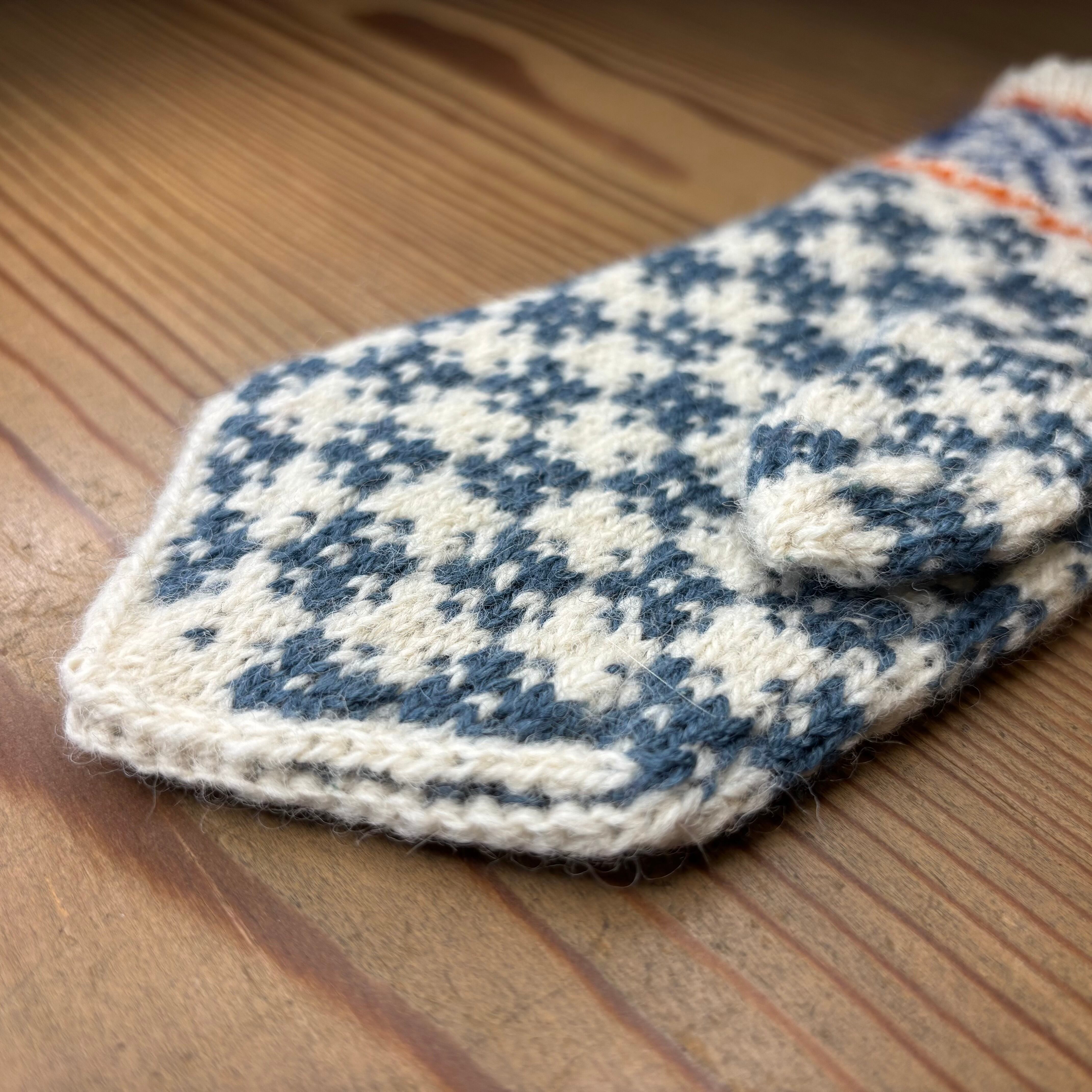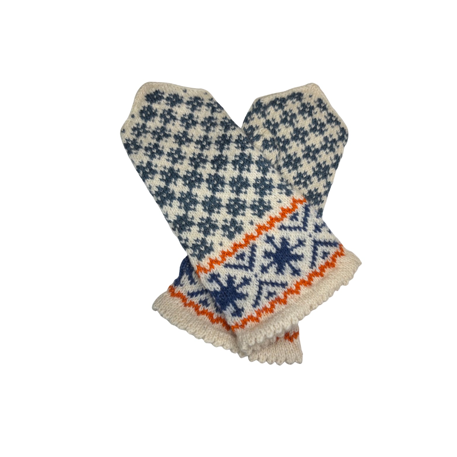 三角形の指先をした可愛らしいフォルムと、やさしい色味の伝統模様が印象的な、ラトビアの手編みミトンです。