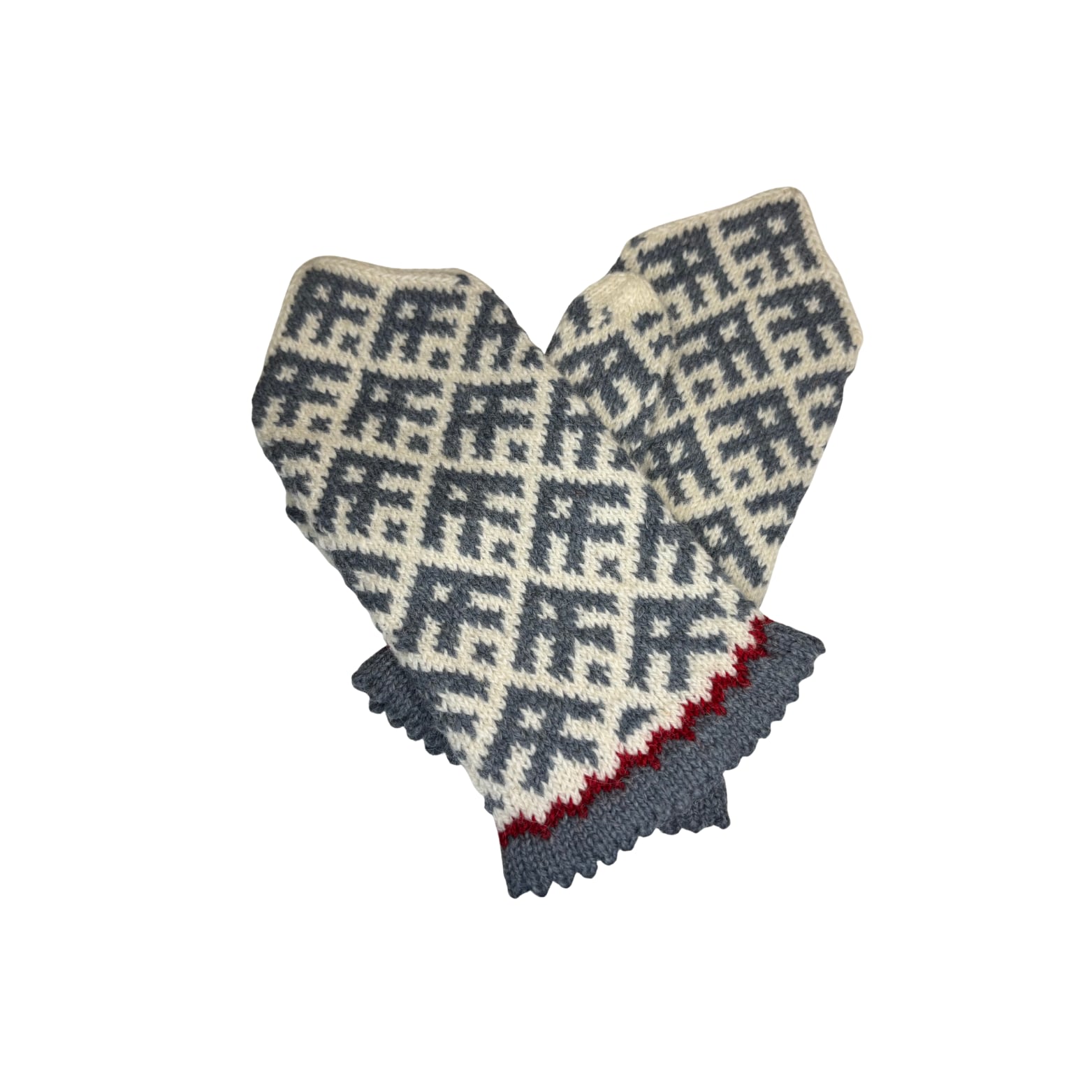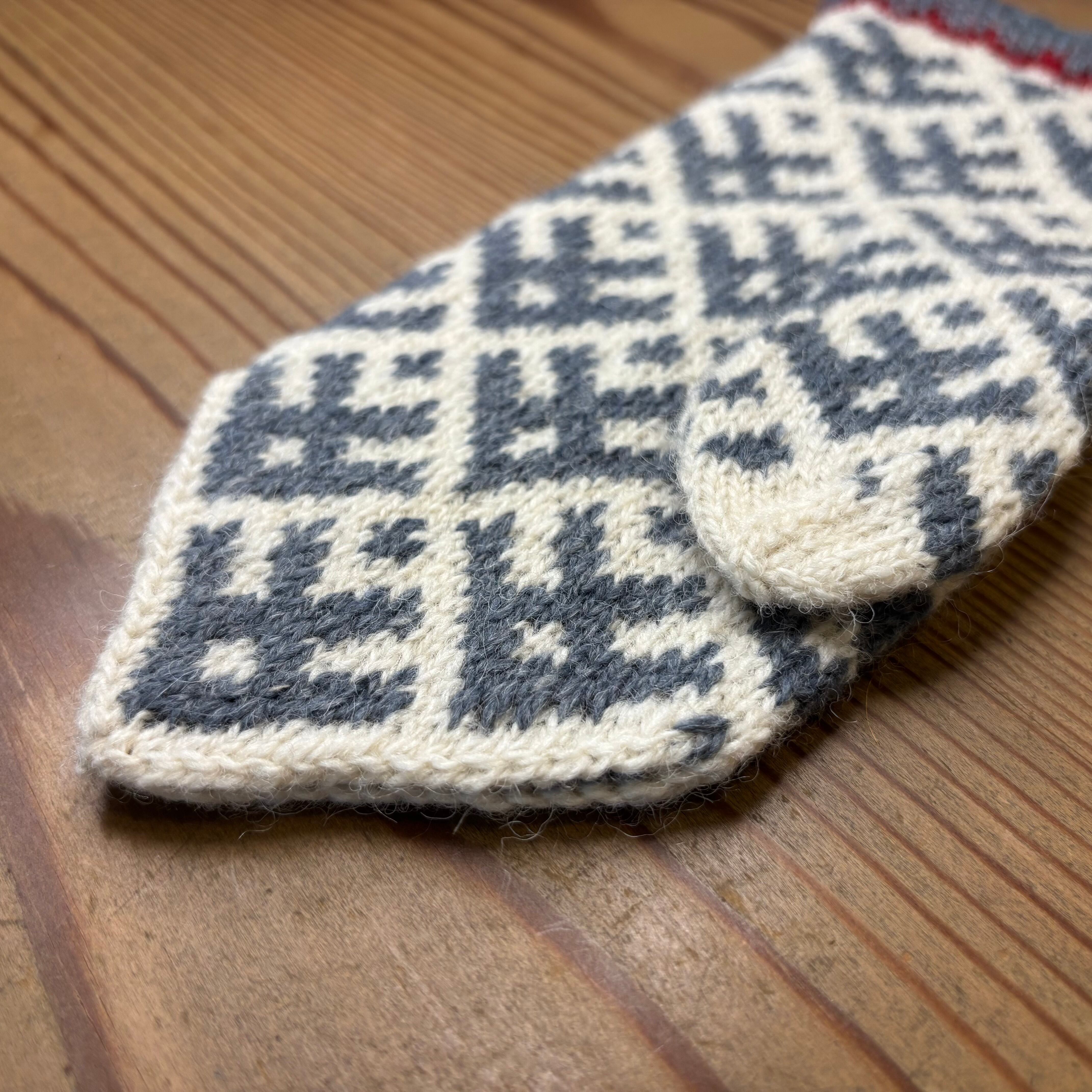 三角形の指先をした可愛らしいフォルムと、やさしい色味の伝統模様が印象的な、ラトビアの手編みミトンです。