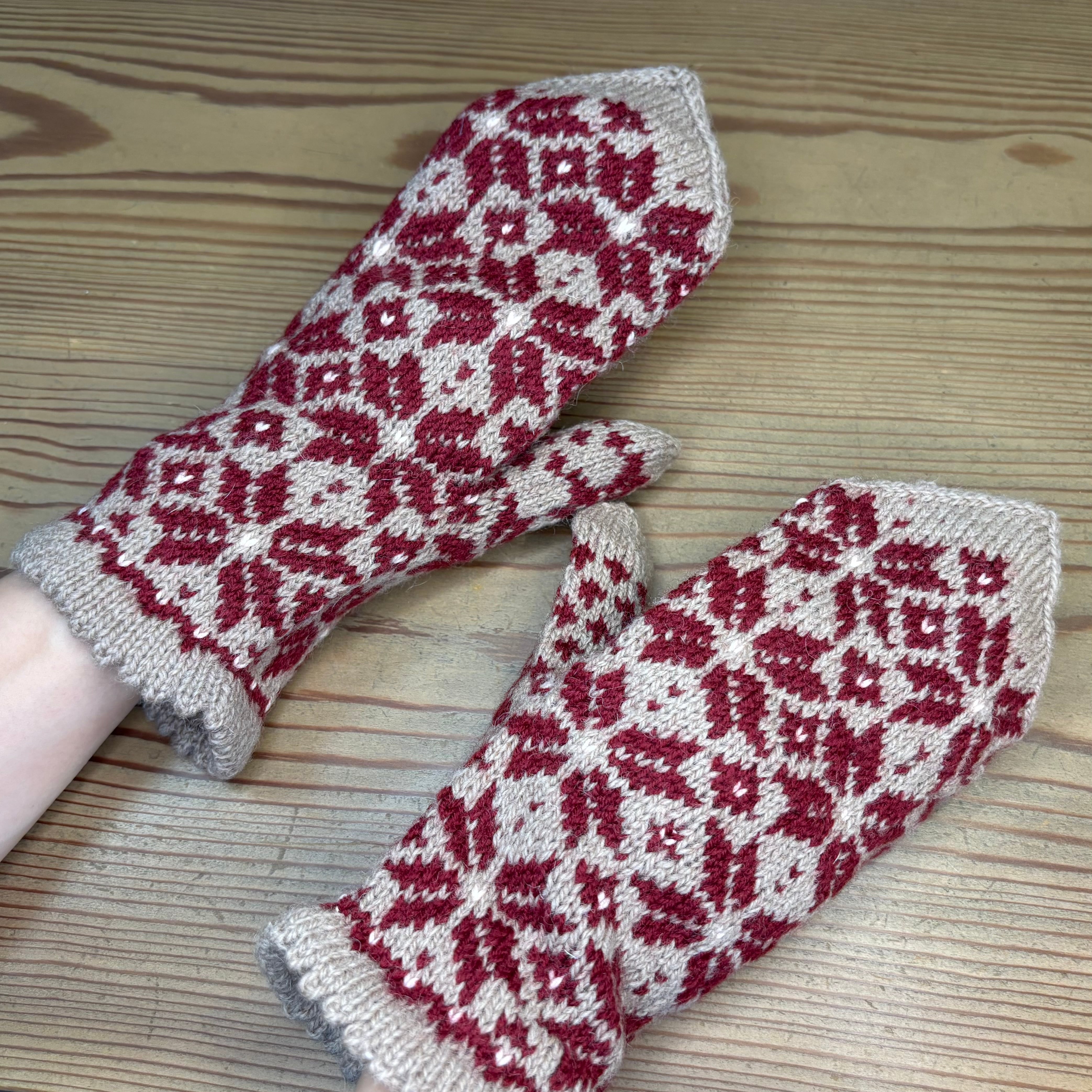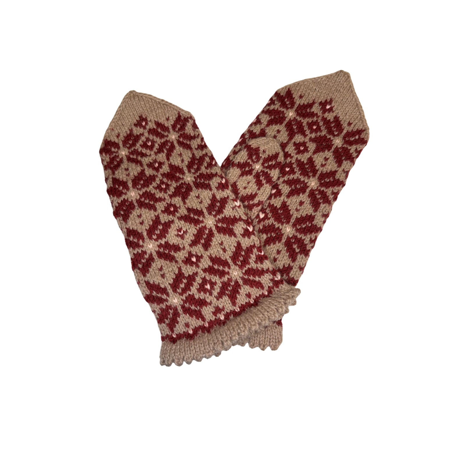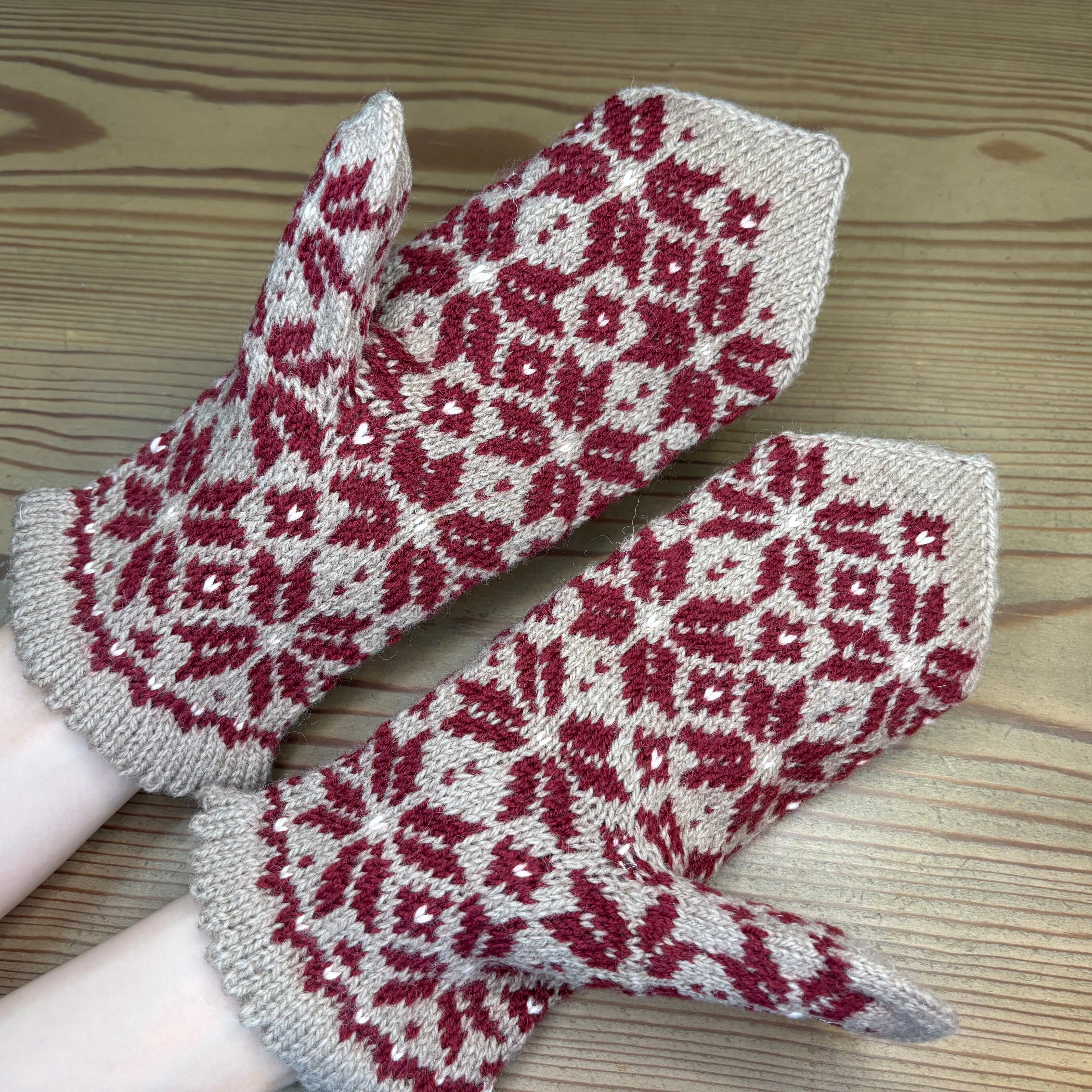 三角形の指先をした可愛らしいフォルムと、やさしい色味の伝統模様が印象的な、ラトビアの手編みミトンです。