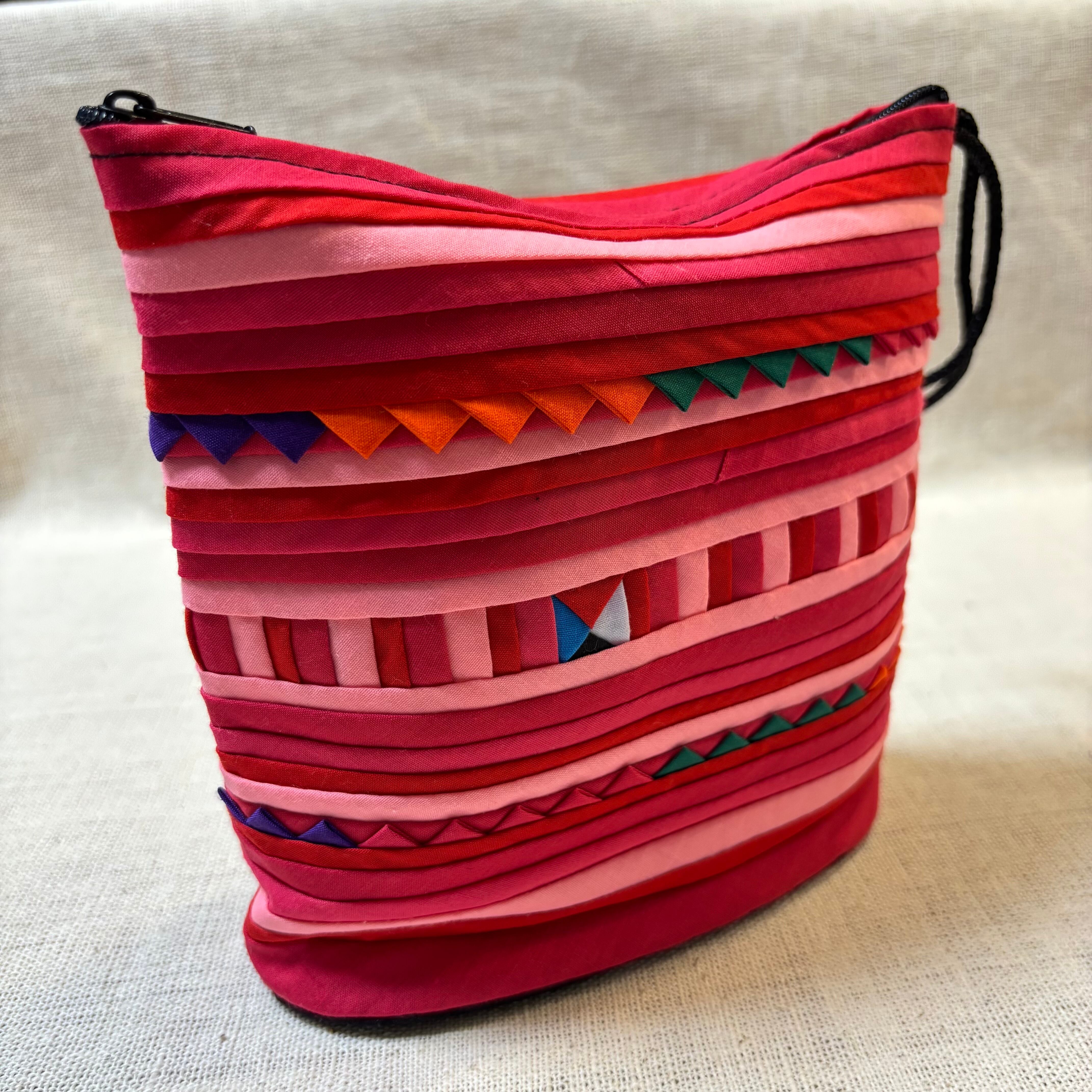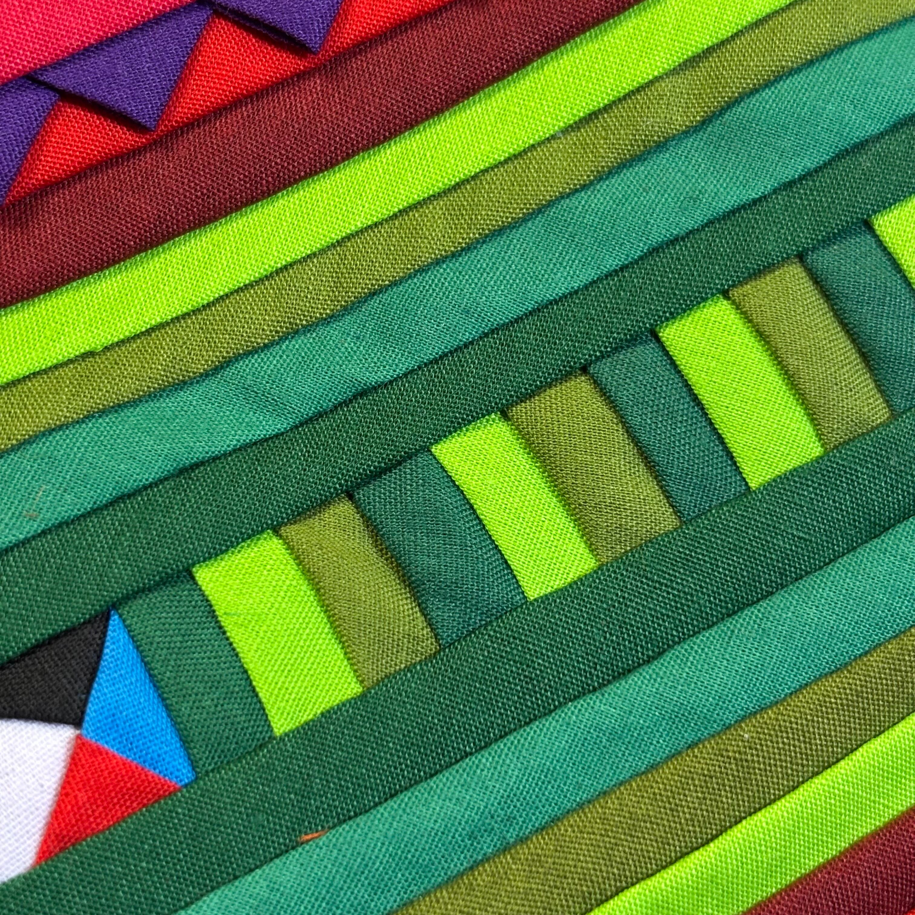 三角形や四角形、縞模様などの幾何学的な形に切られた布を、色のバランスを考えながら手で縫い重ねていくことで、カラフルで奥行きのある模様が生まれます。