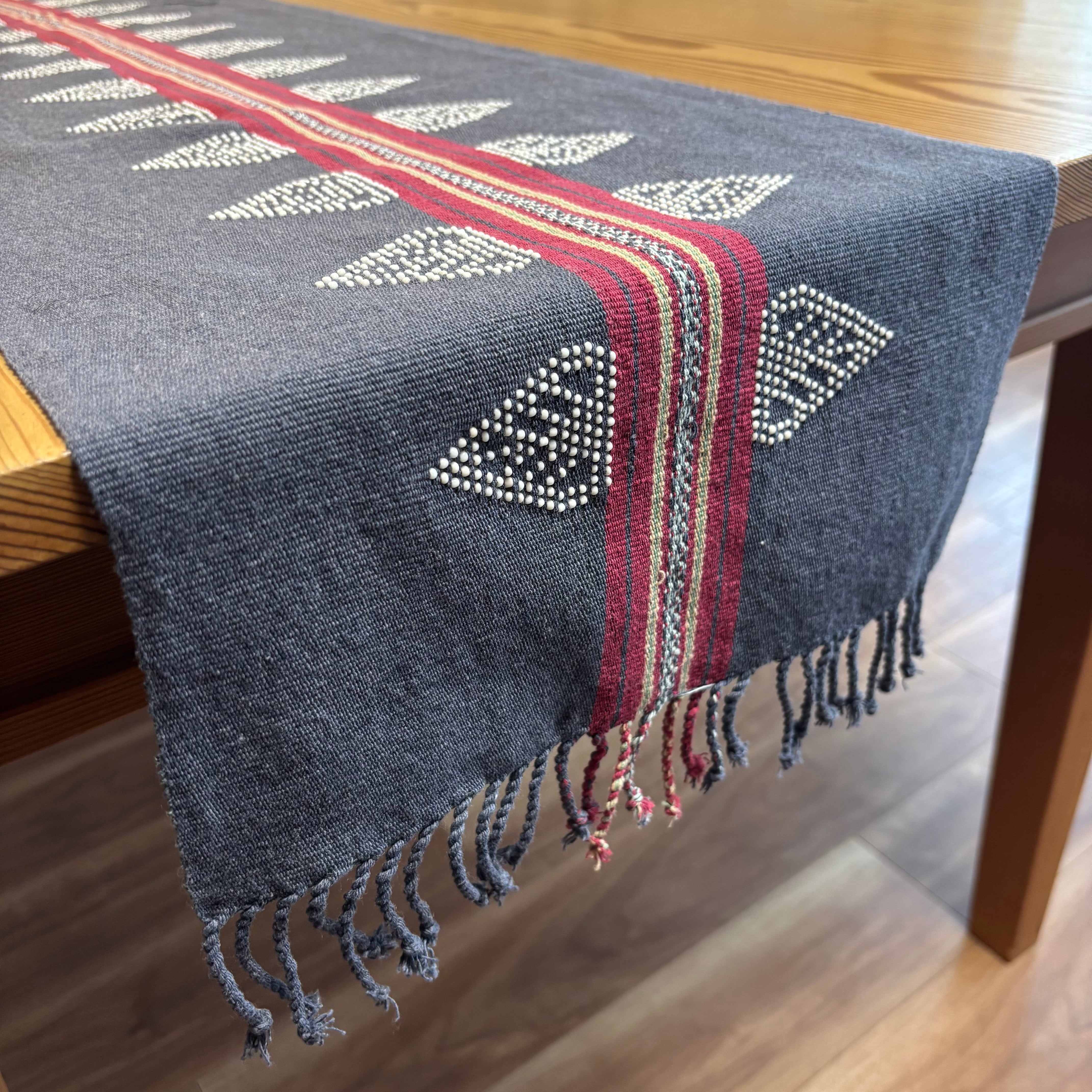 テーブルランナーとしてだけでなく、棚やチェストの上に敷いたり、空間のアクセントとしても楽しめる一枚です。
