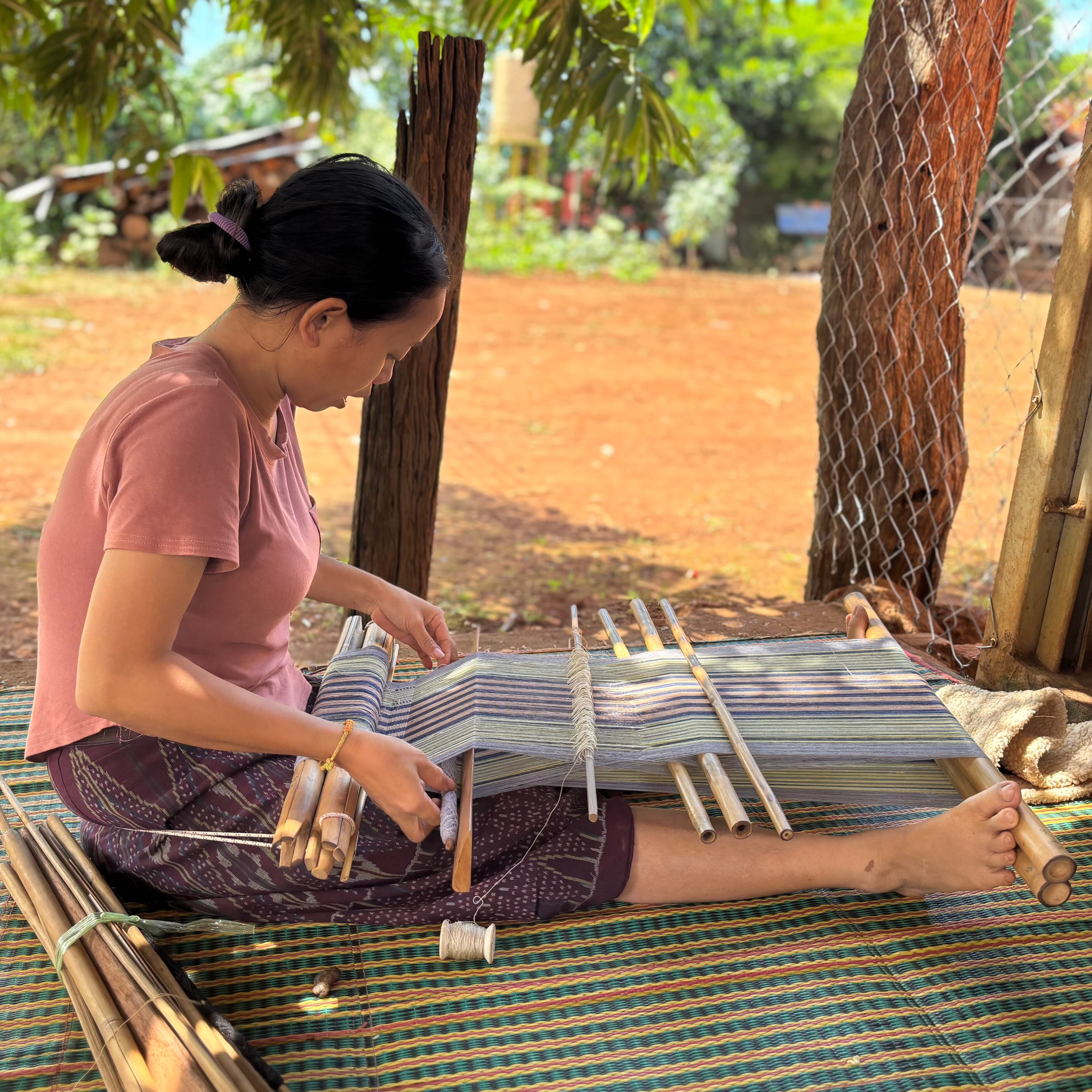 腰機(こしばた)と呼ばれる伝統的な織機を使い、織り手が身体で糸の張りを調整しながら一つひとつ織り上げています。
