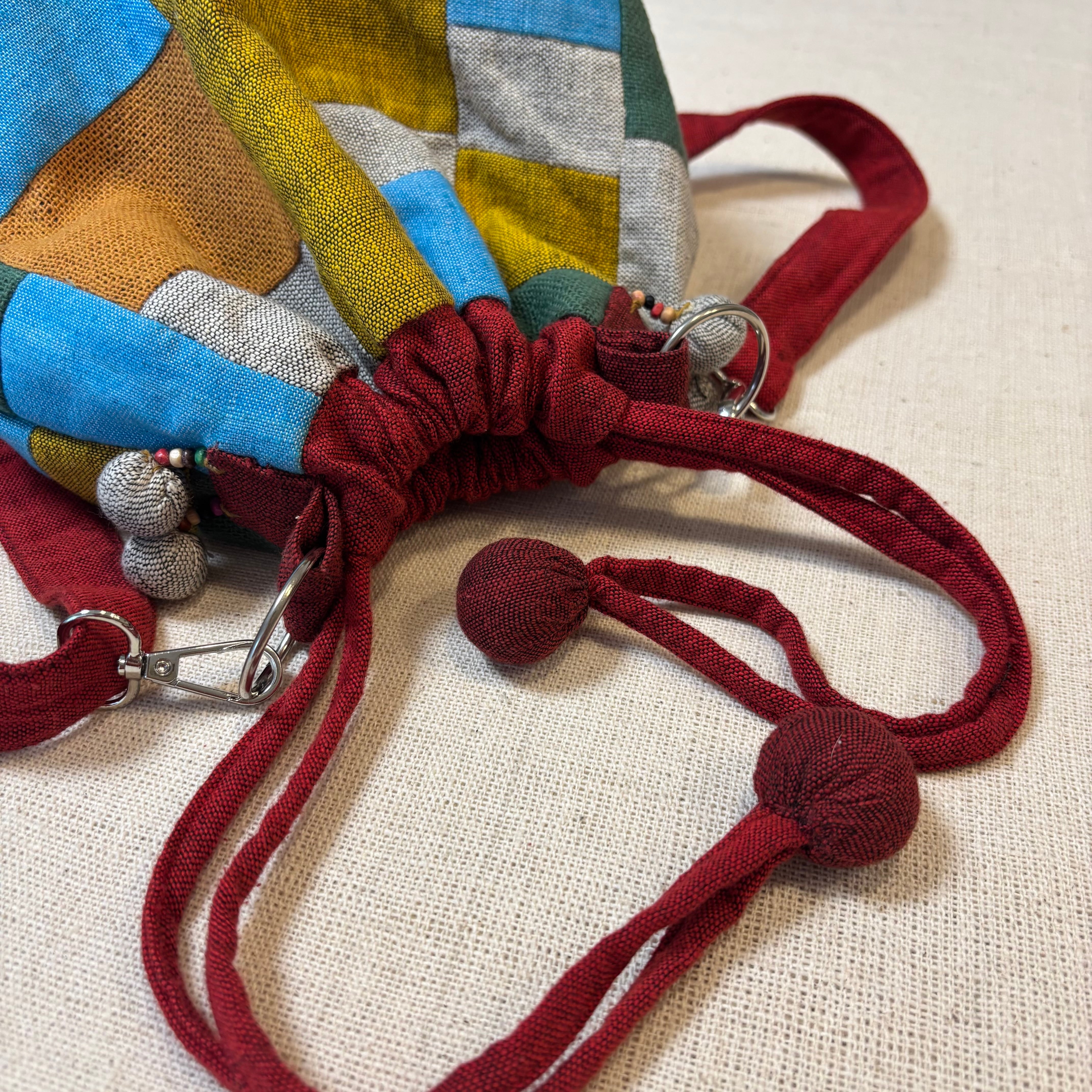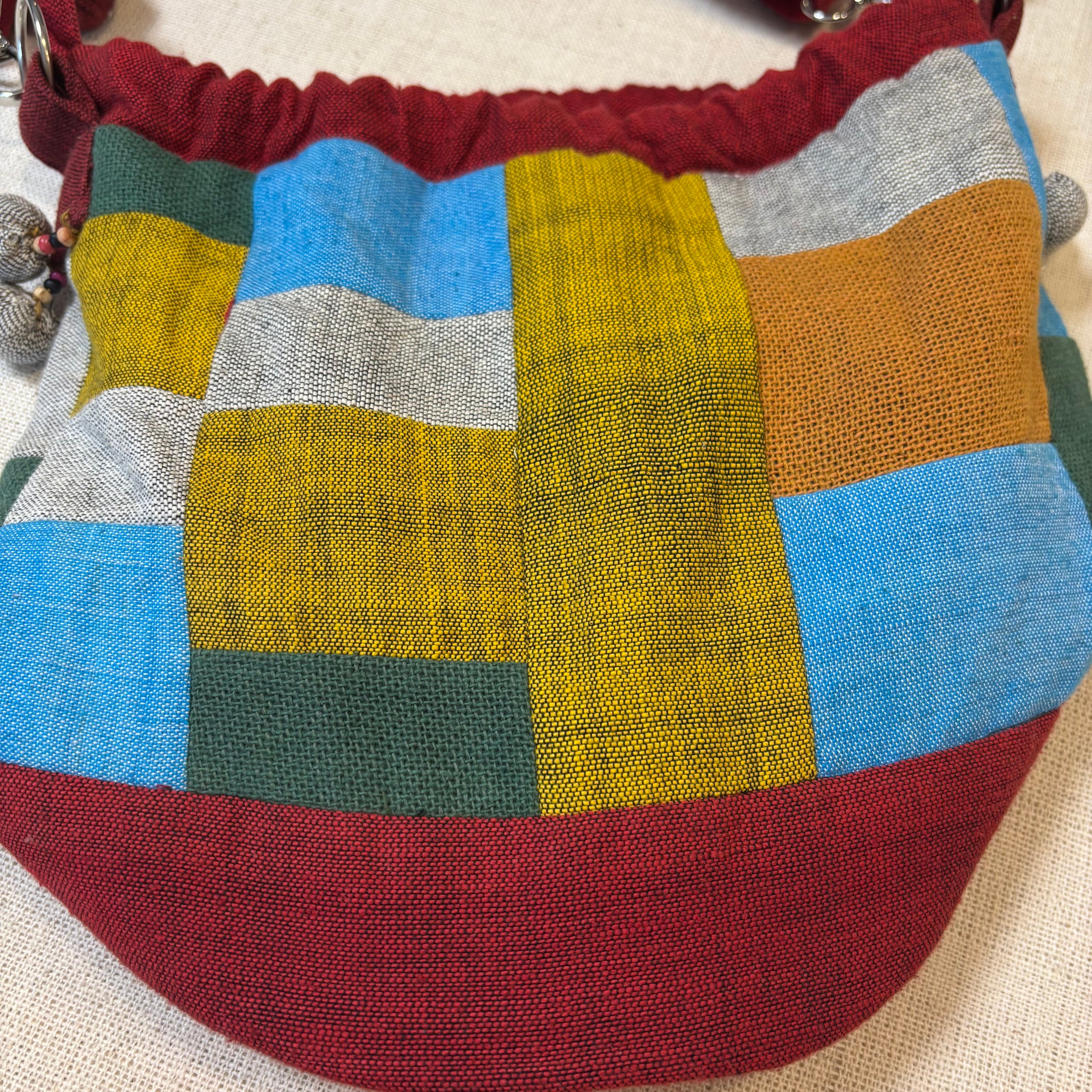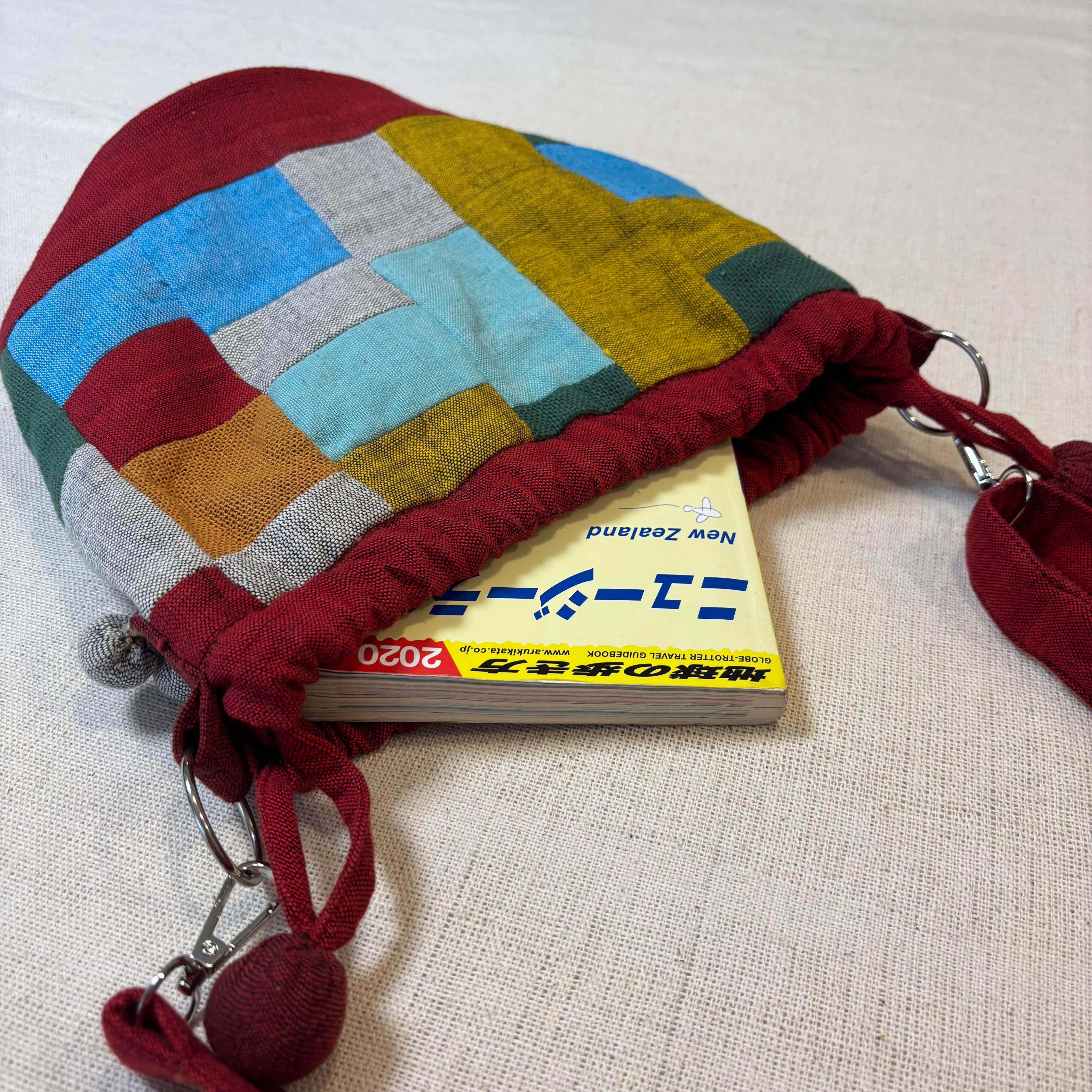草木染めの手織り布を組み合わせたパッチワークが印象的で、それぞれの色や風合いの違いが楽しめます。