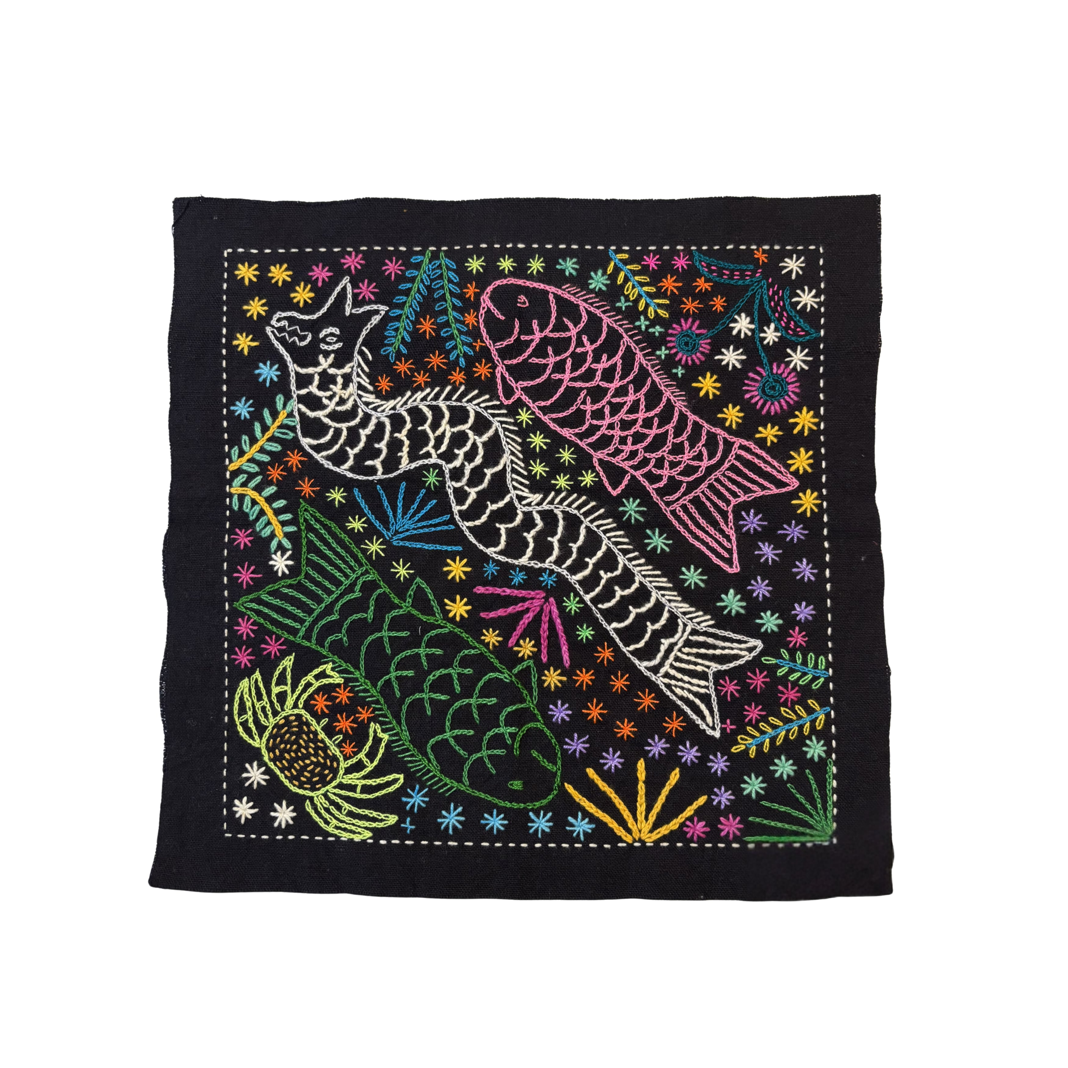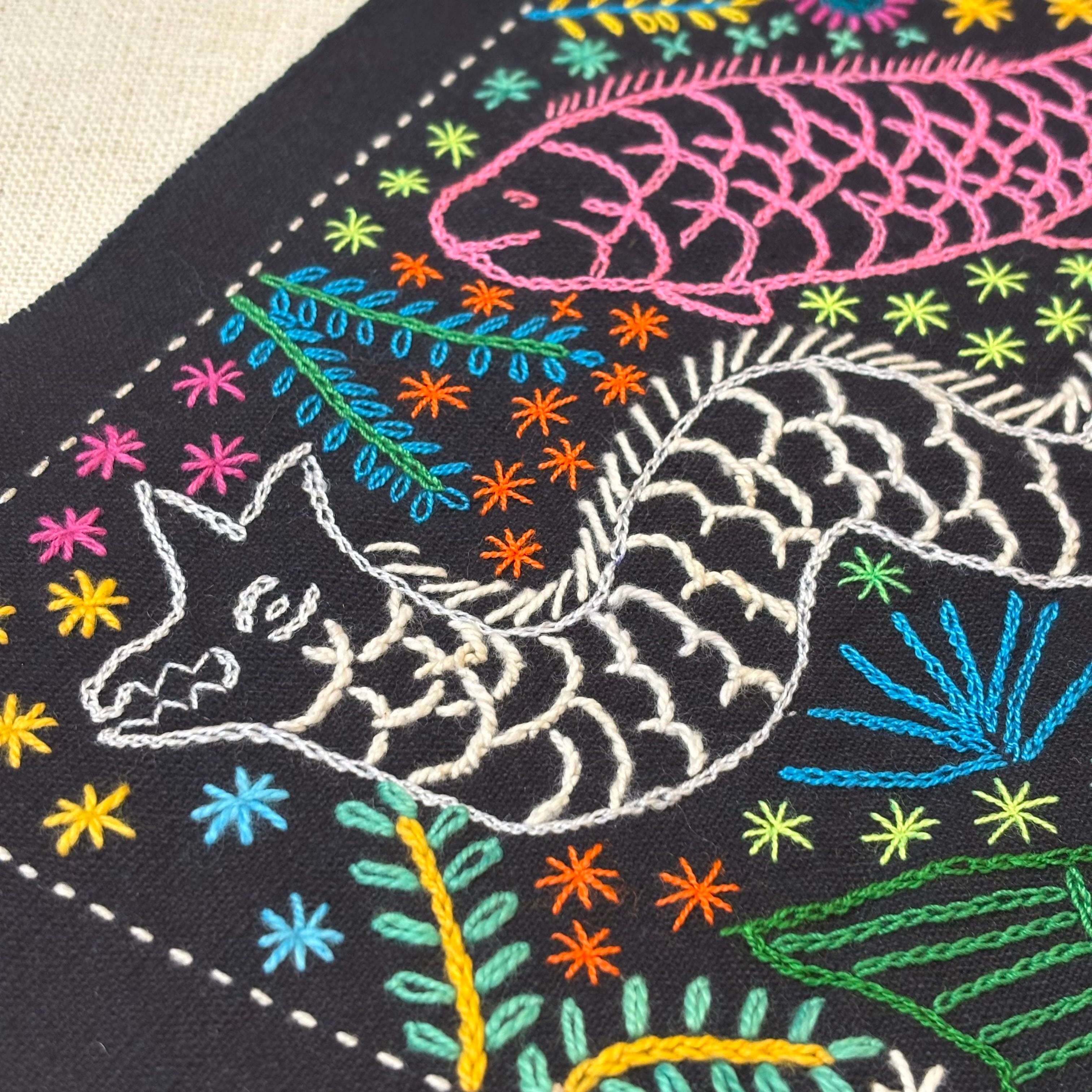 鮮やかな色使いと華やかな印象の中に、素朴であたたかみのある刺繍の表情が感じられます。