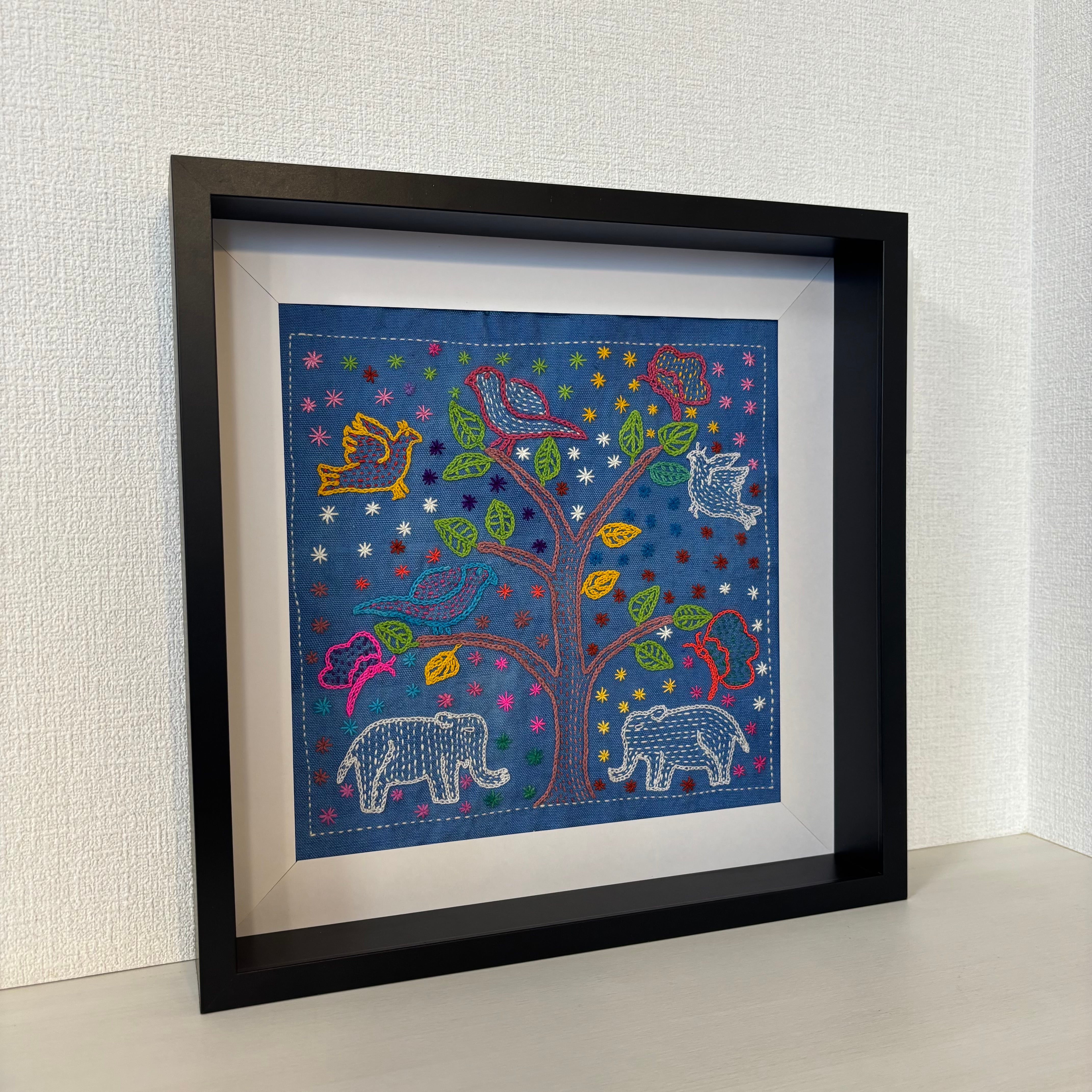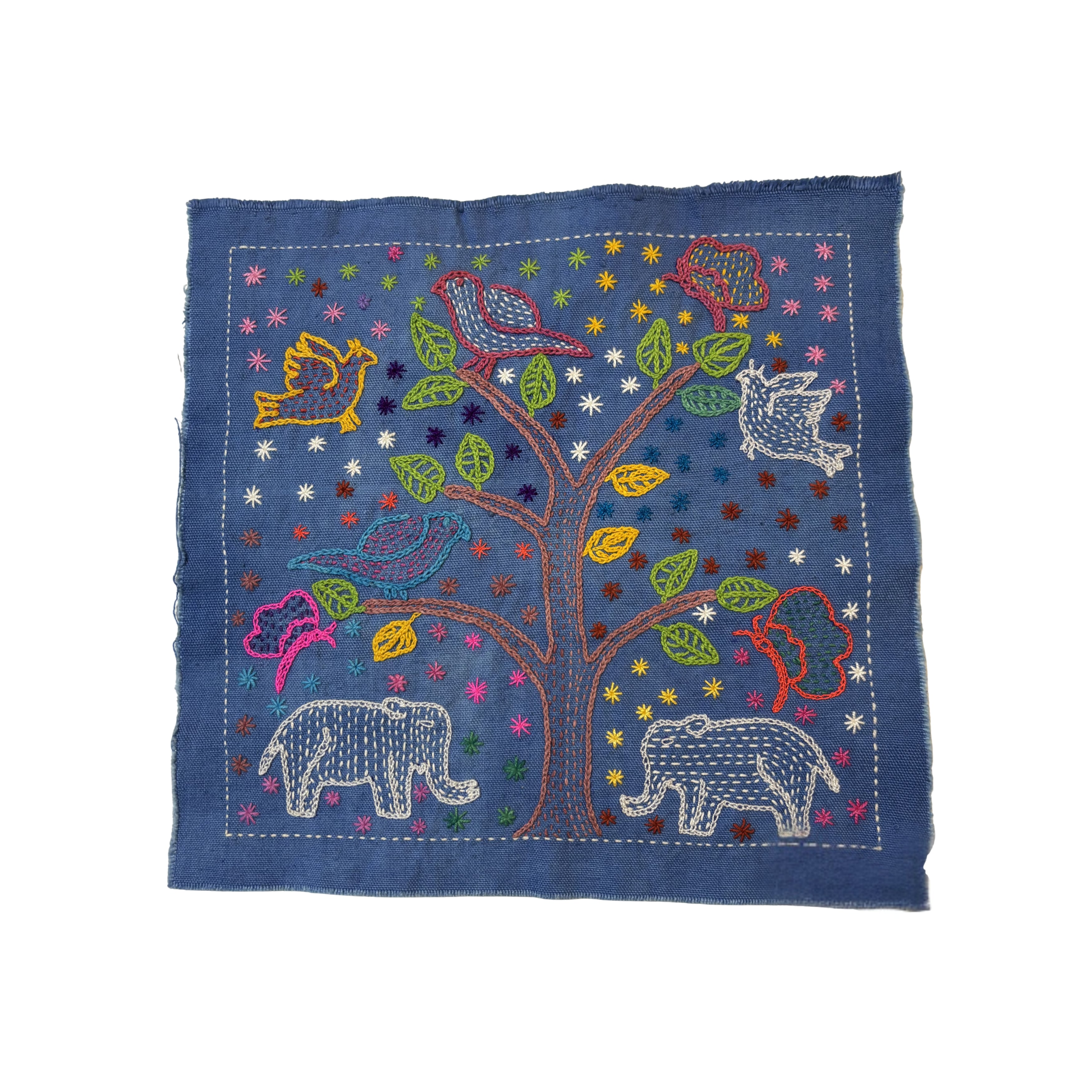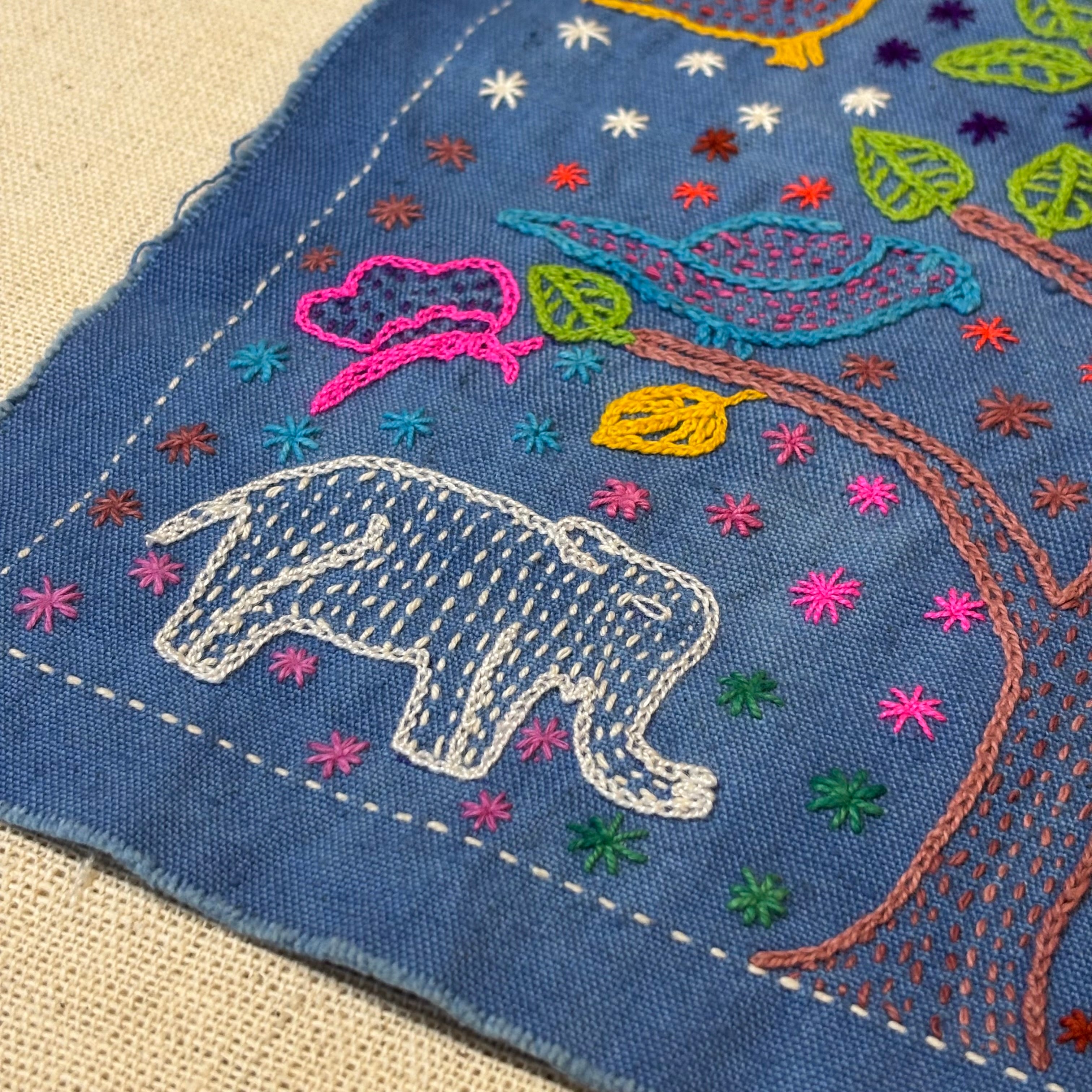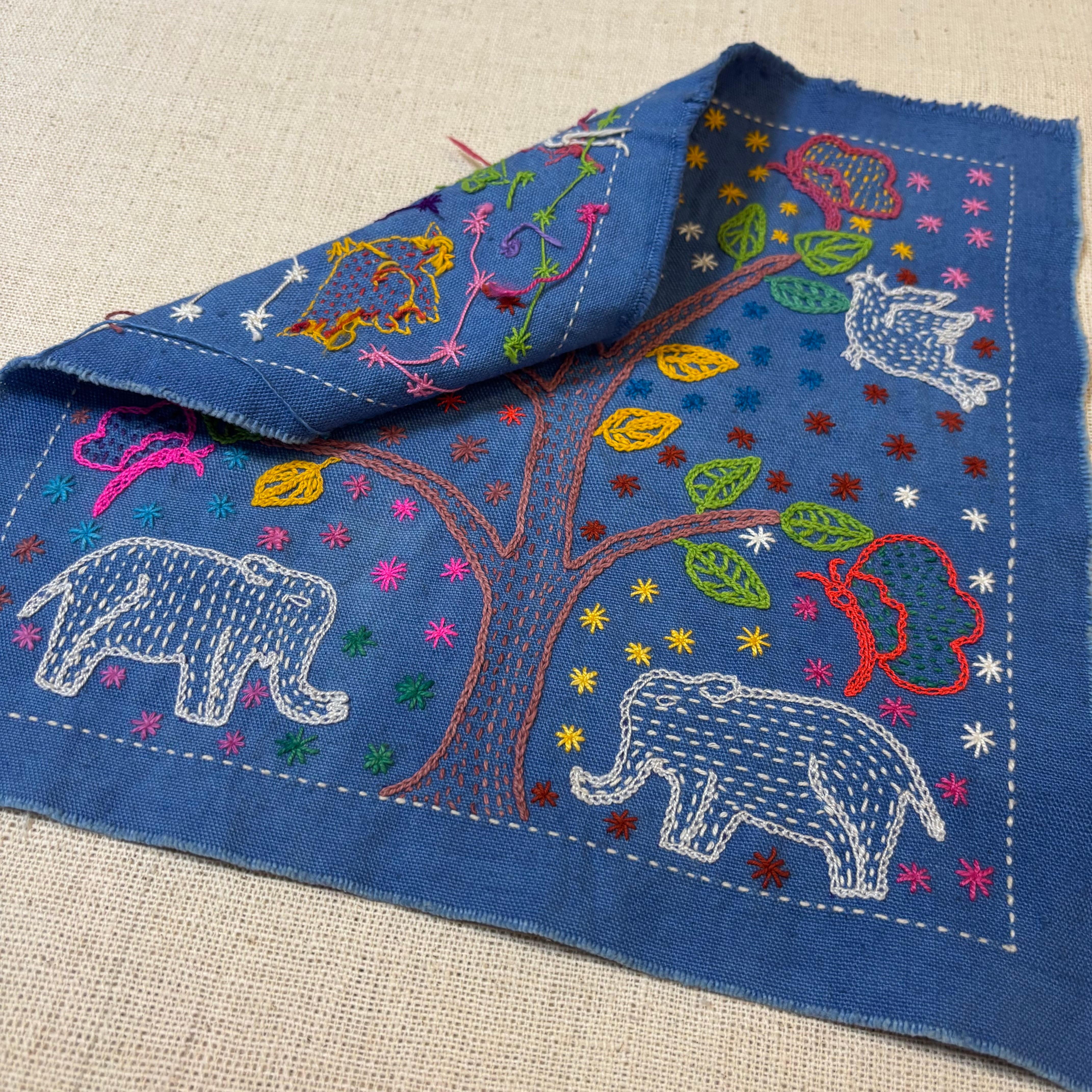 そのまま額に入れて飾ったり、バッグやポーチに縫い付けてアクセントにしたりと、暮らしの中でさまざまな楽しみ方ができる一枚です。手を加えることで、自分だけの一点ものとして育てていくのも魅力のひとつです。