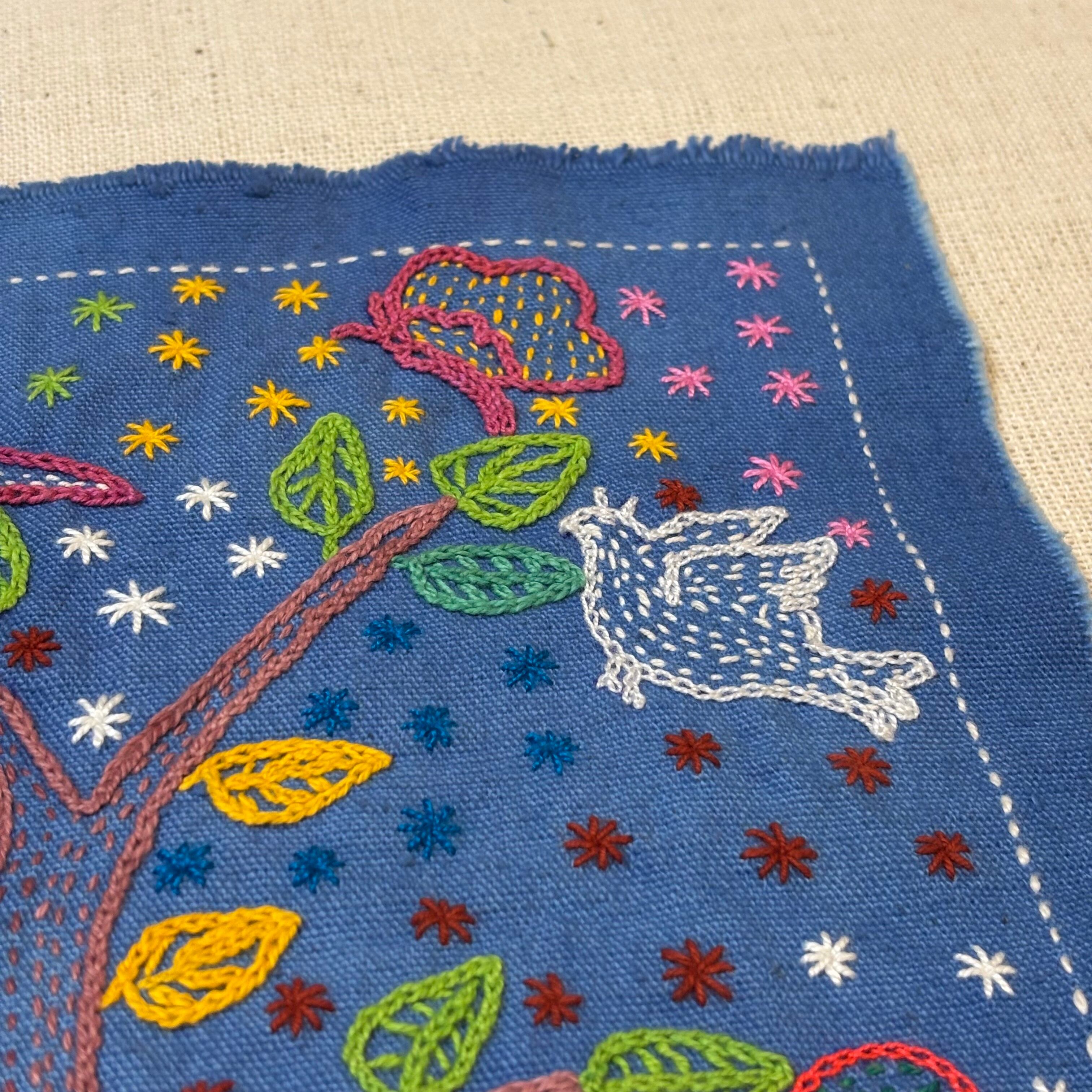 鮮やかな色使いと華やかな印象の中に、素朴であたたかみのある刺繍の表情が感じられます。