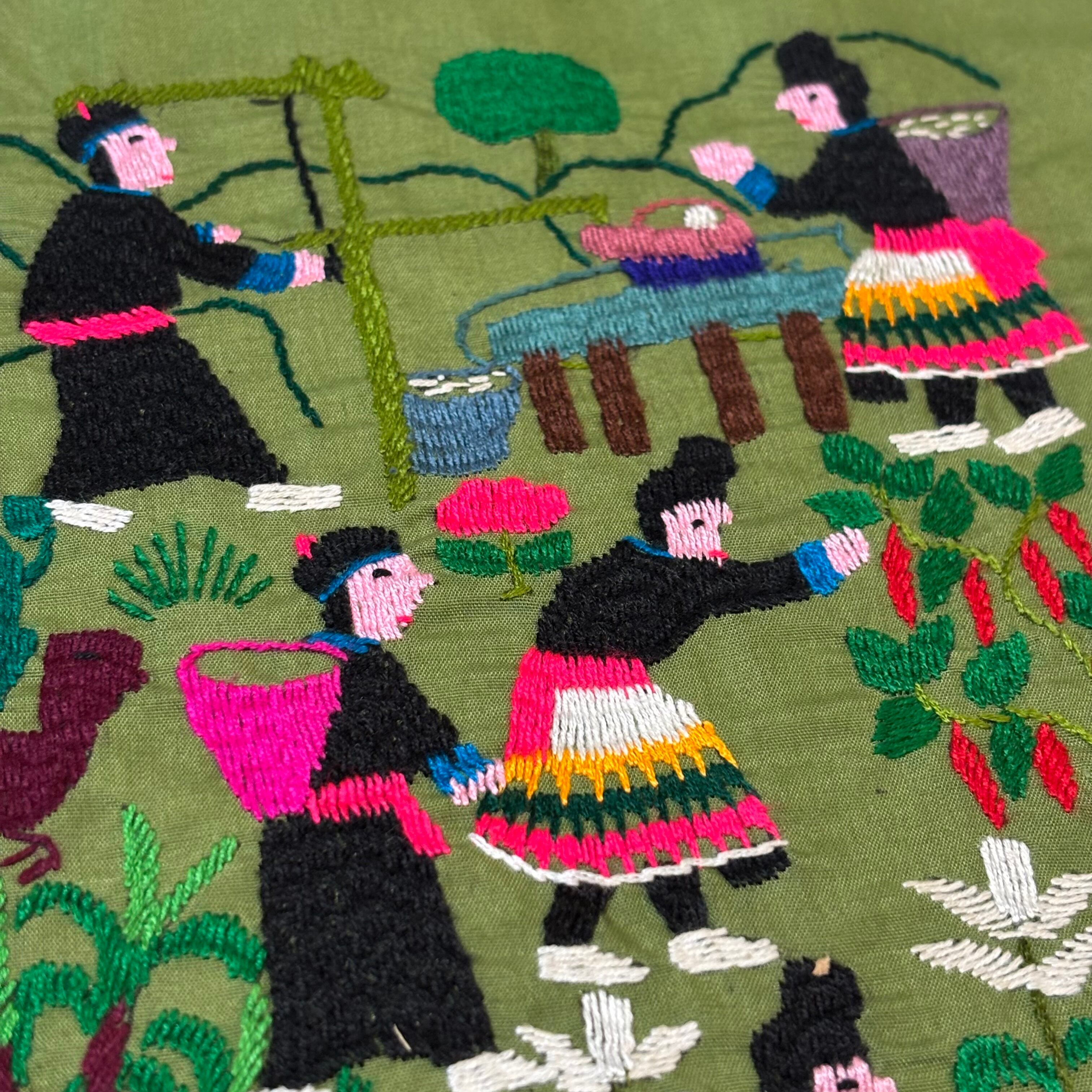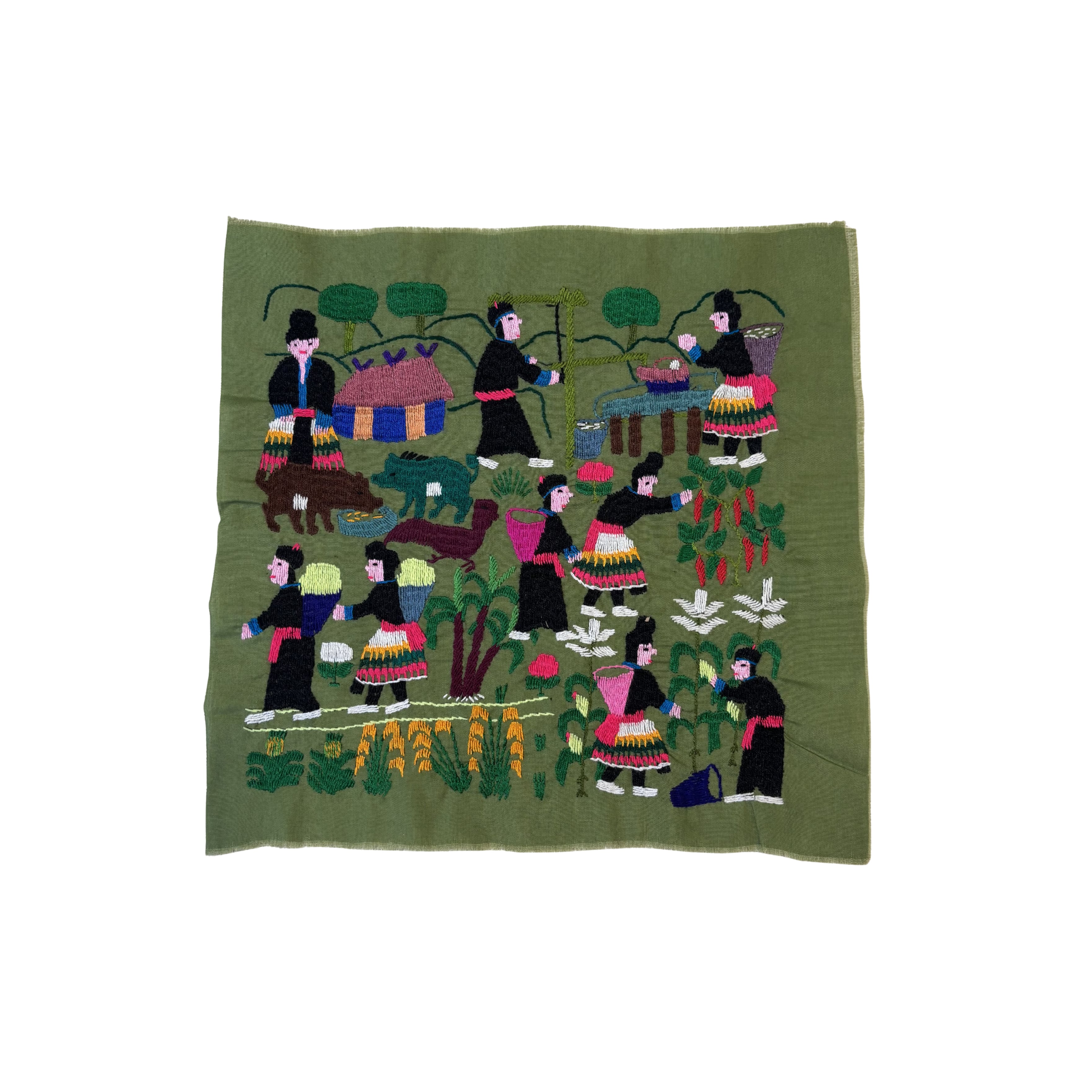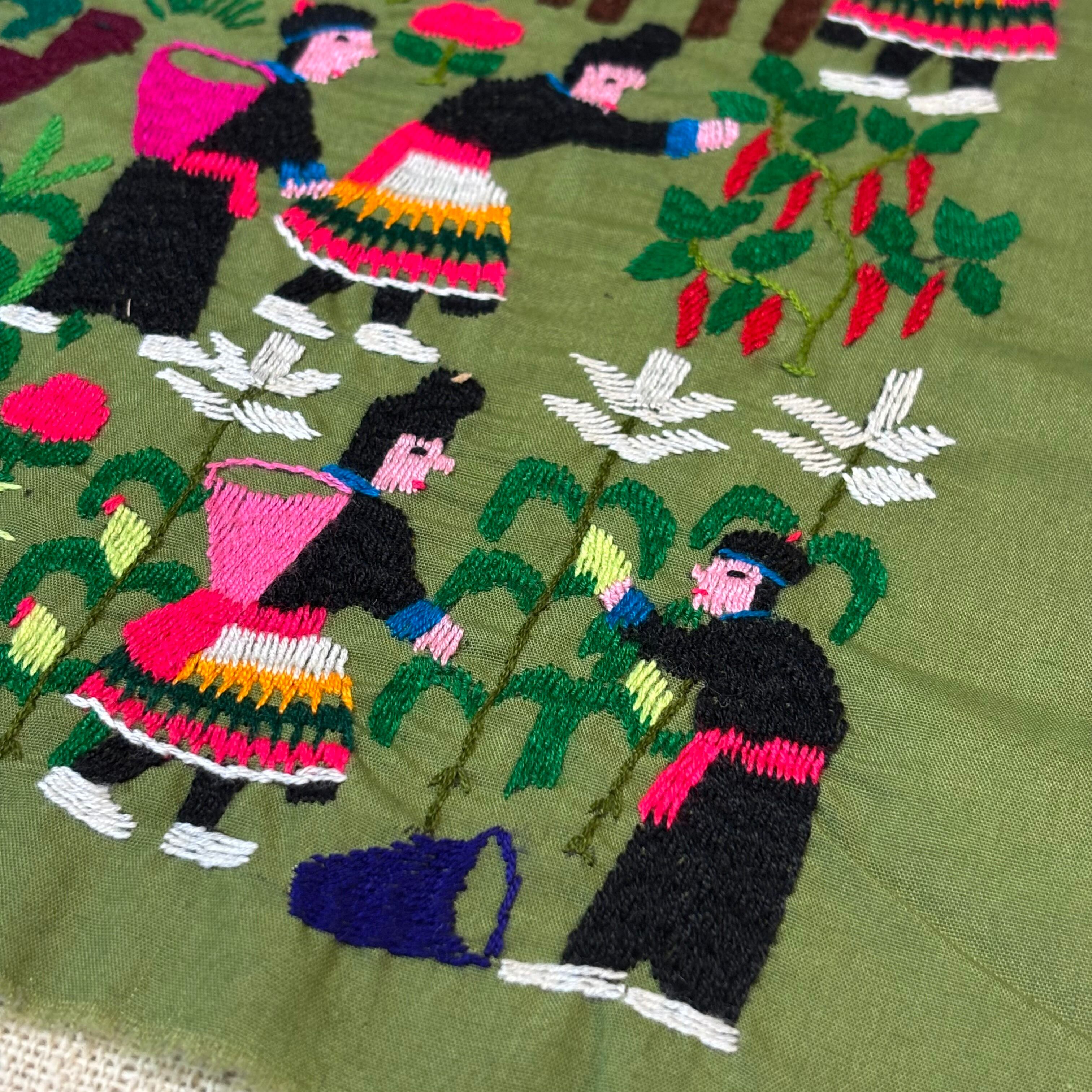 布いっぱいに広がる刺繍には、伝統的な暮らしの風景が素朴で温かみのある表情で描かれています。