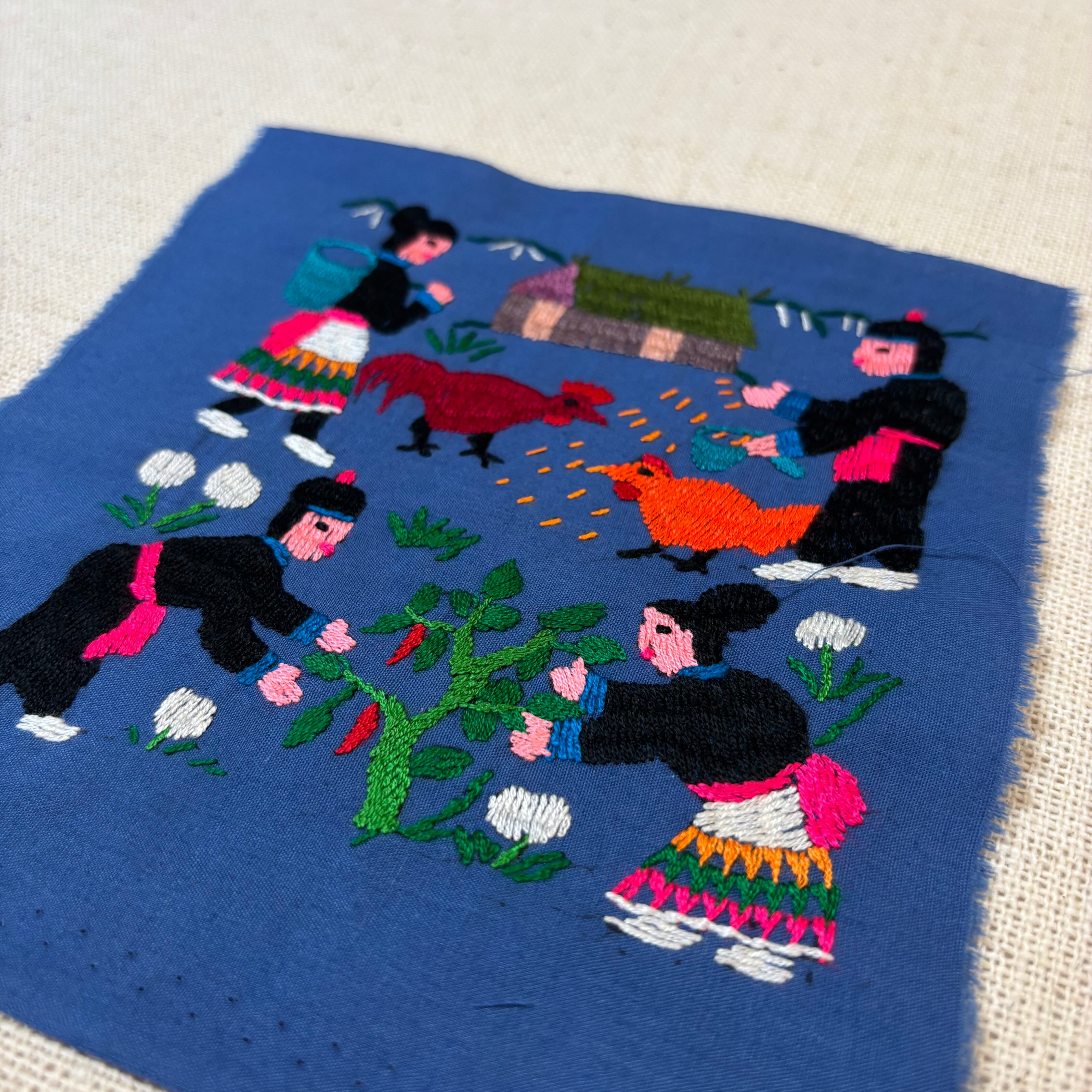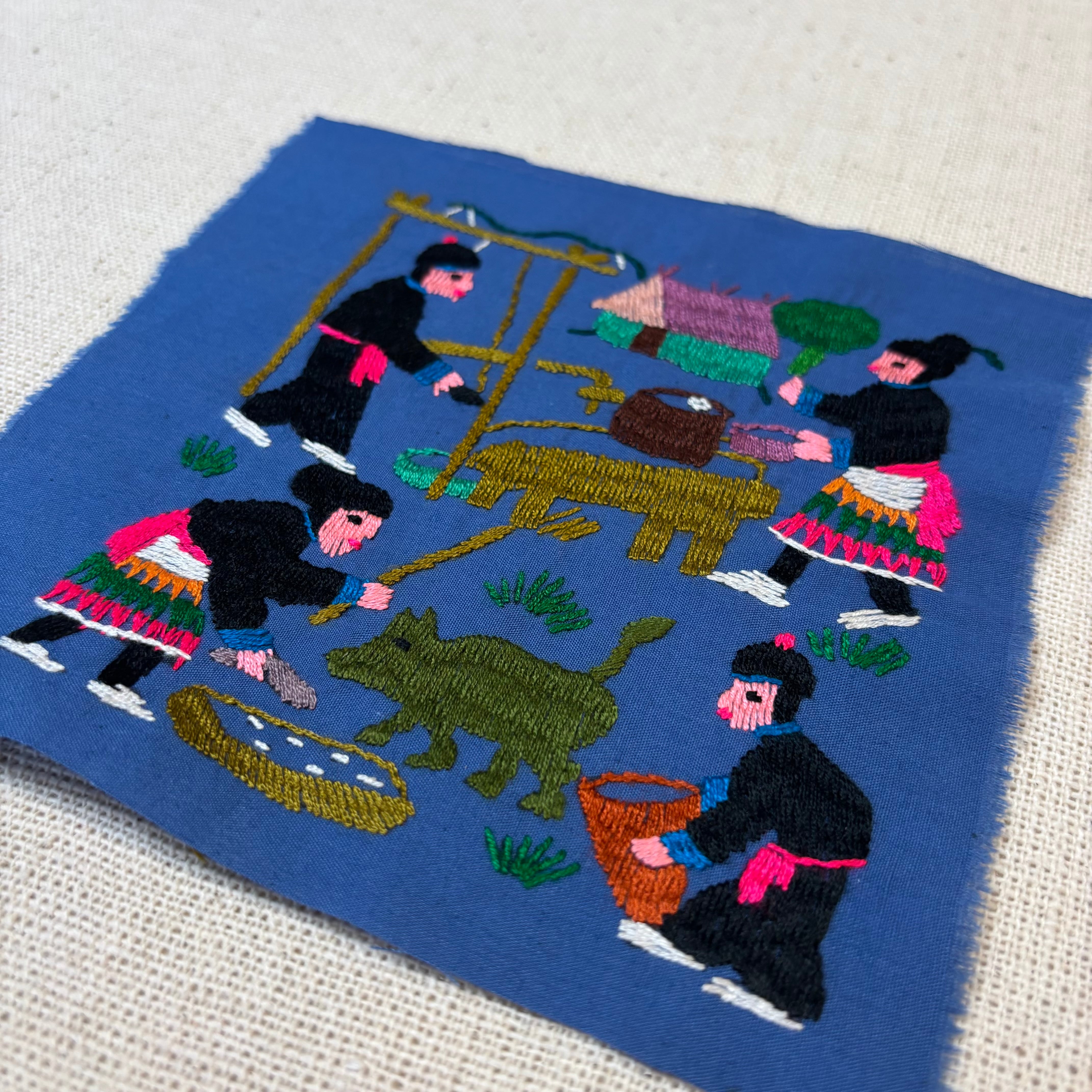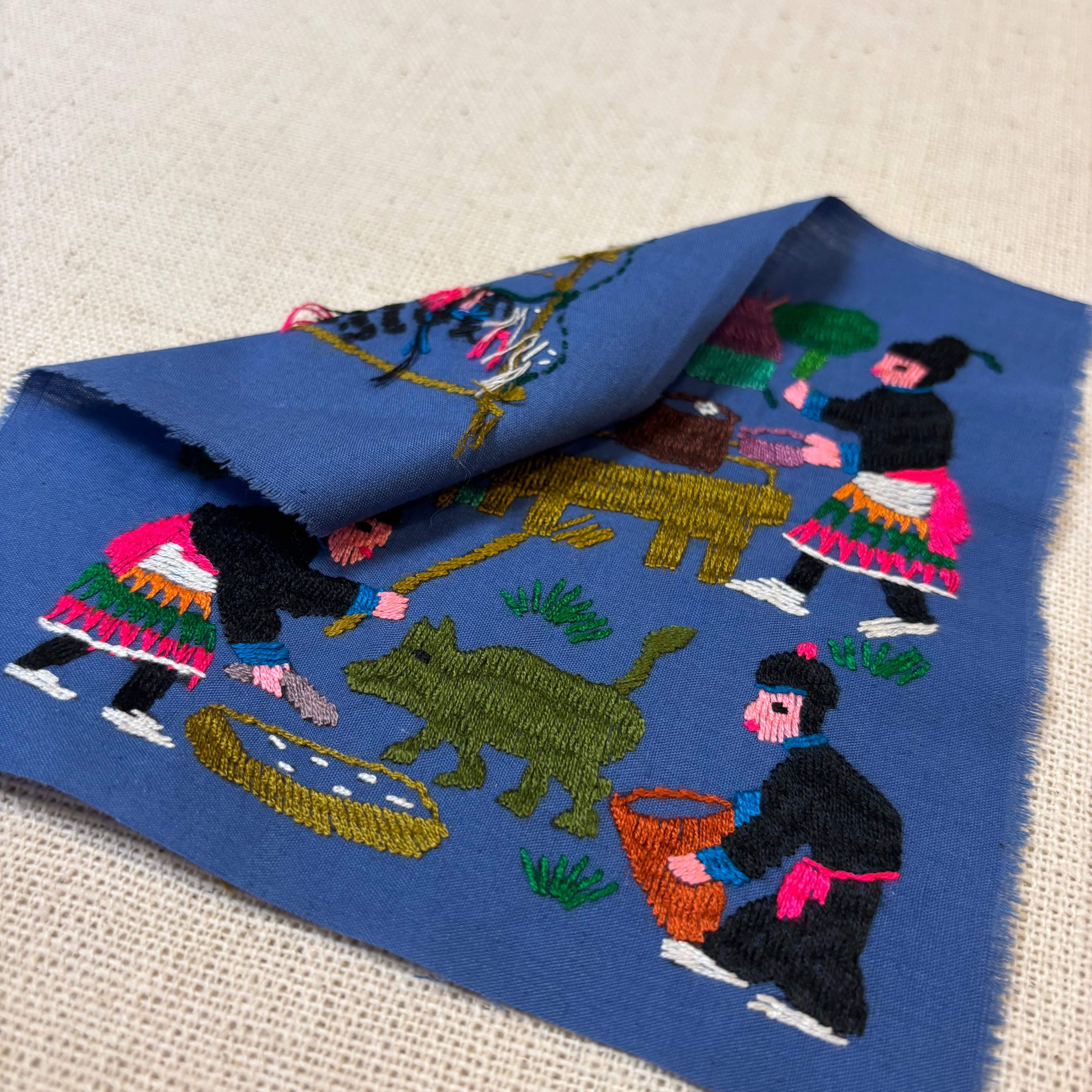 布いっぱいに広がる刺繍には、伝統的な暮らしの風景が素朴で温かみのある表情で描かれています。