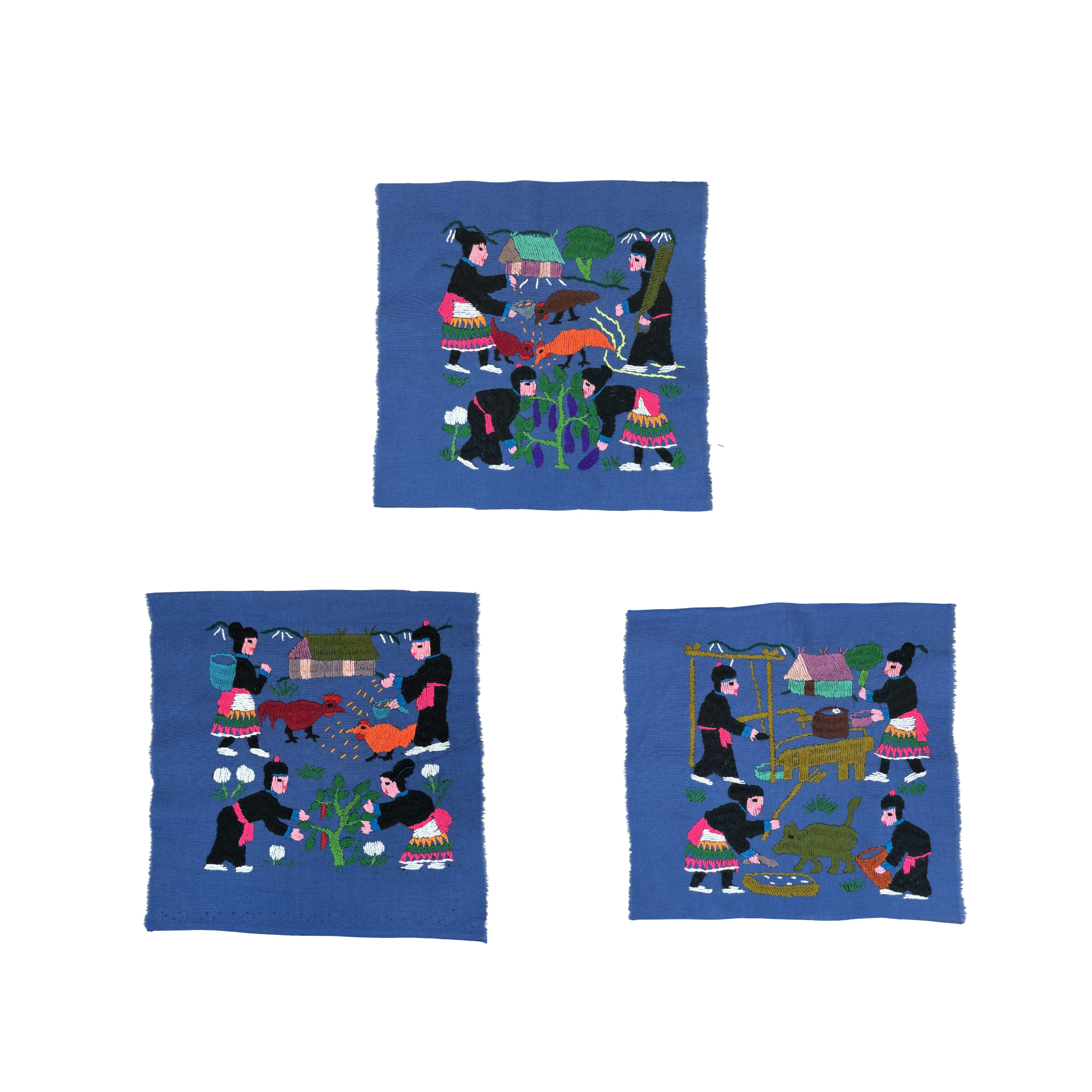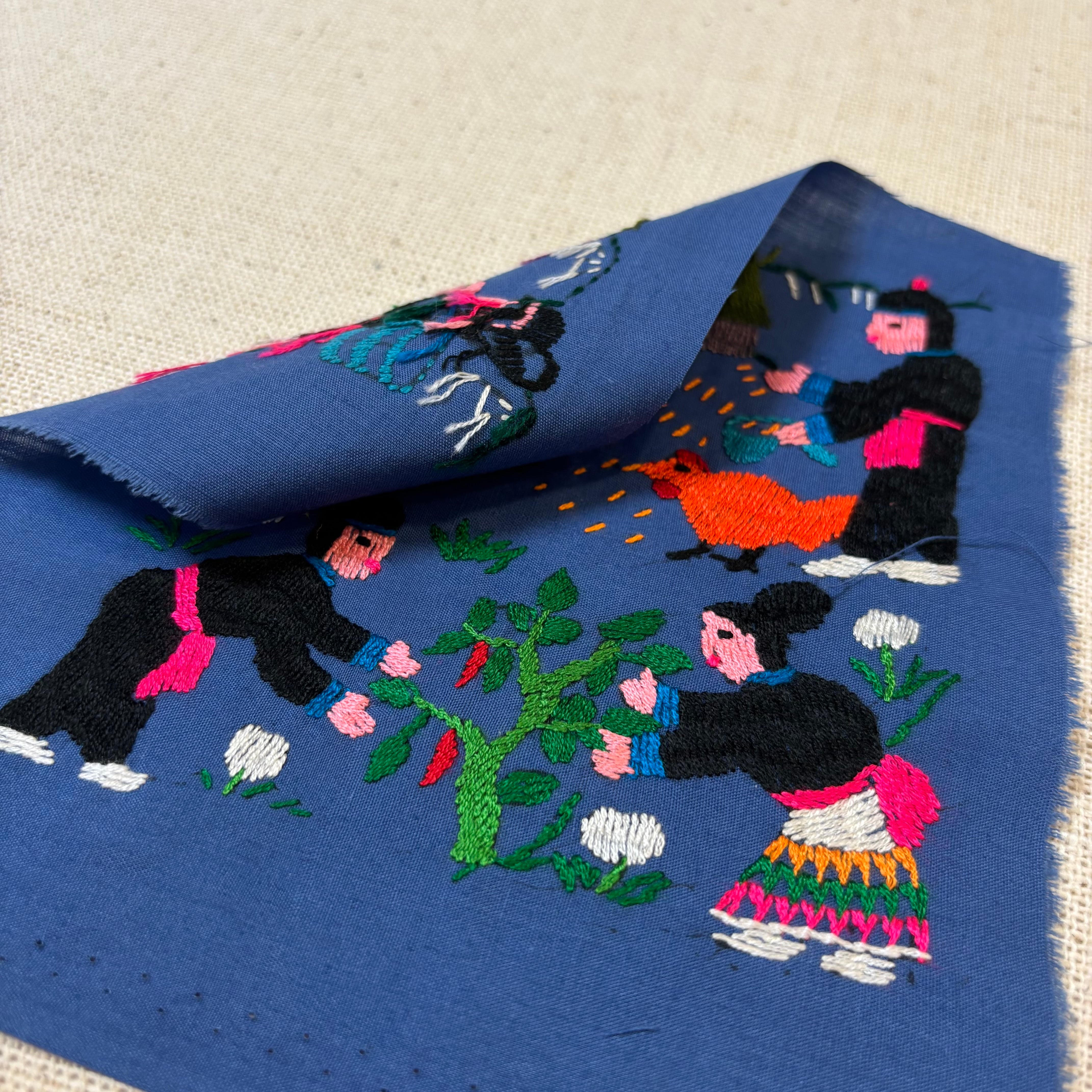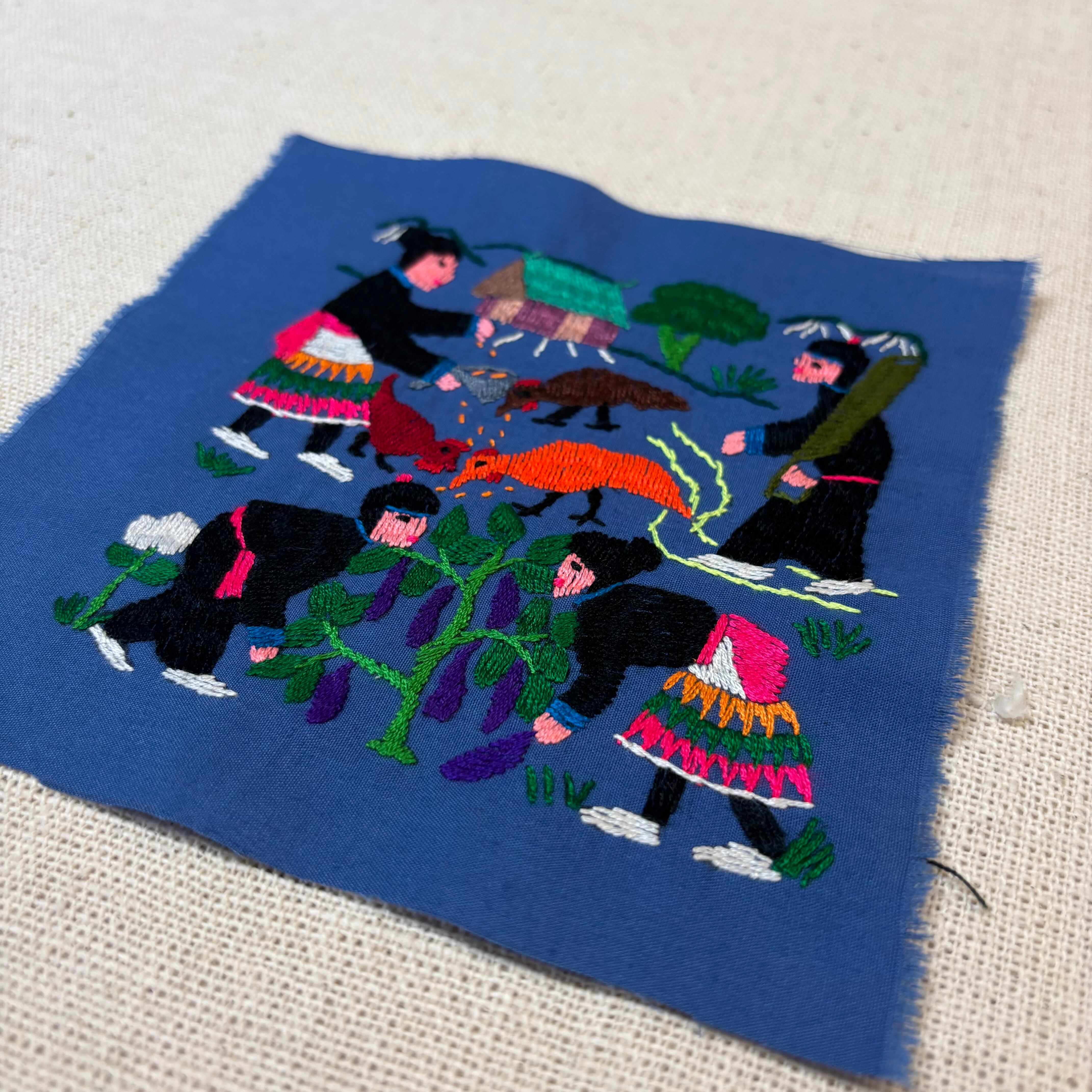 布いっぱいに広がる刺繍には、伝統的な暮らしの風景が素朴で温かみのある表情で描かれています。