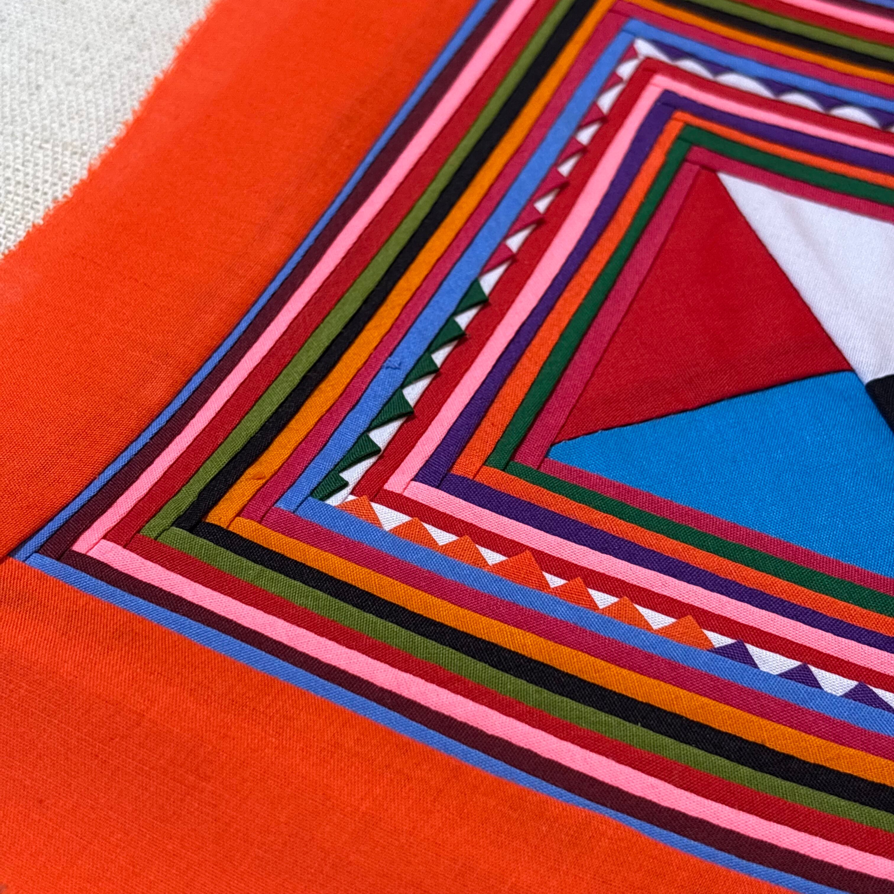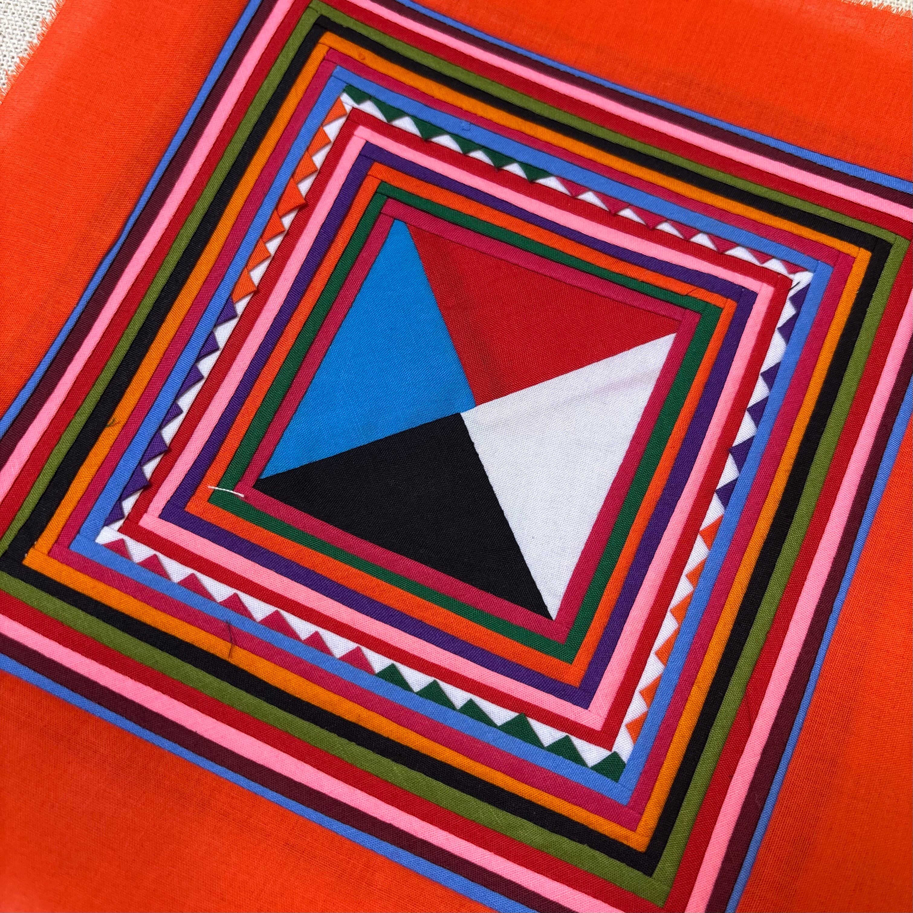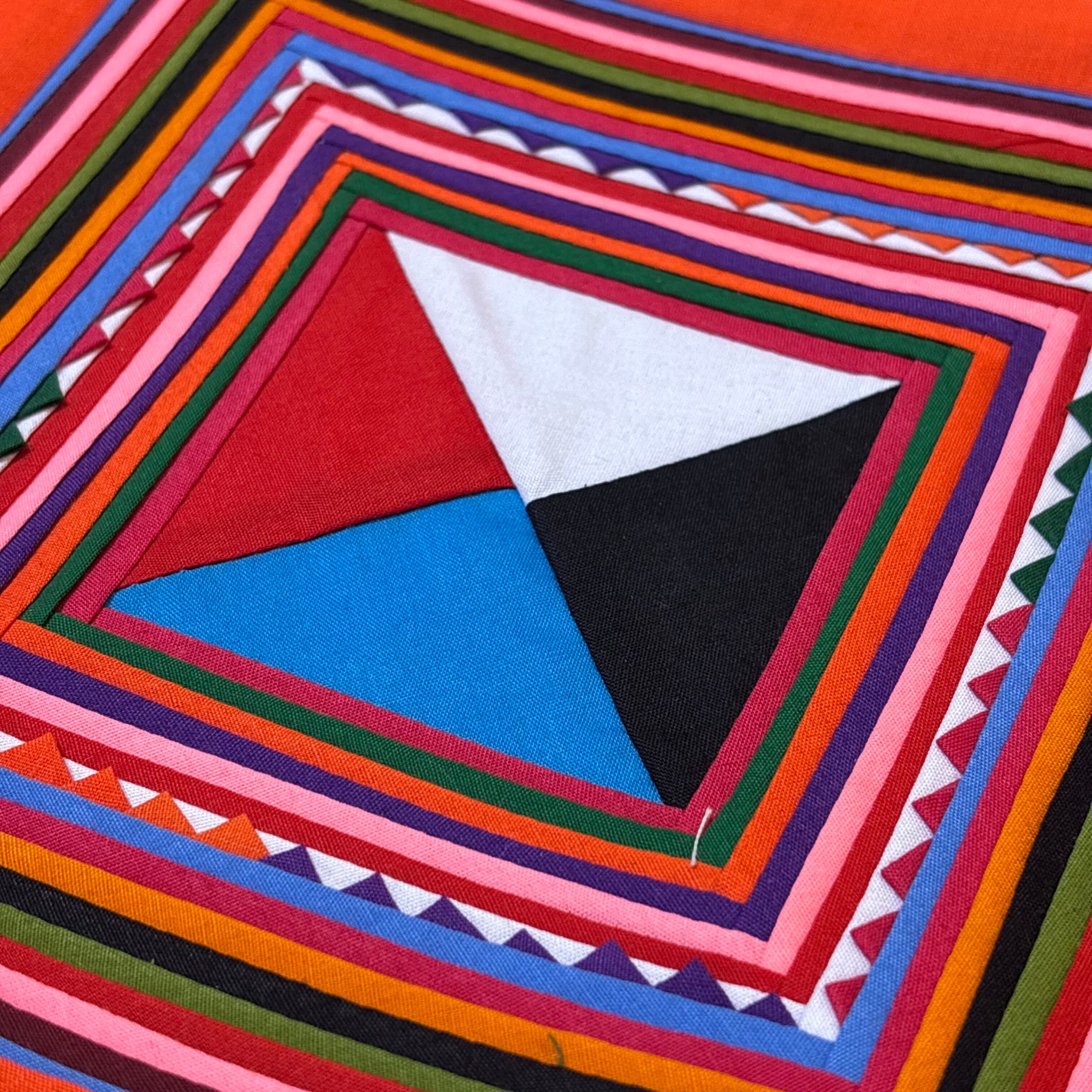 三角形や四角形、縞模様などの幾何学的な形に切られた布を縫い重ねていくことで、カラフルで奥行きのある模様が生まれます。