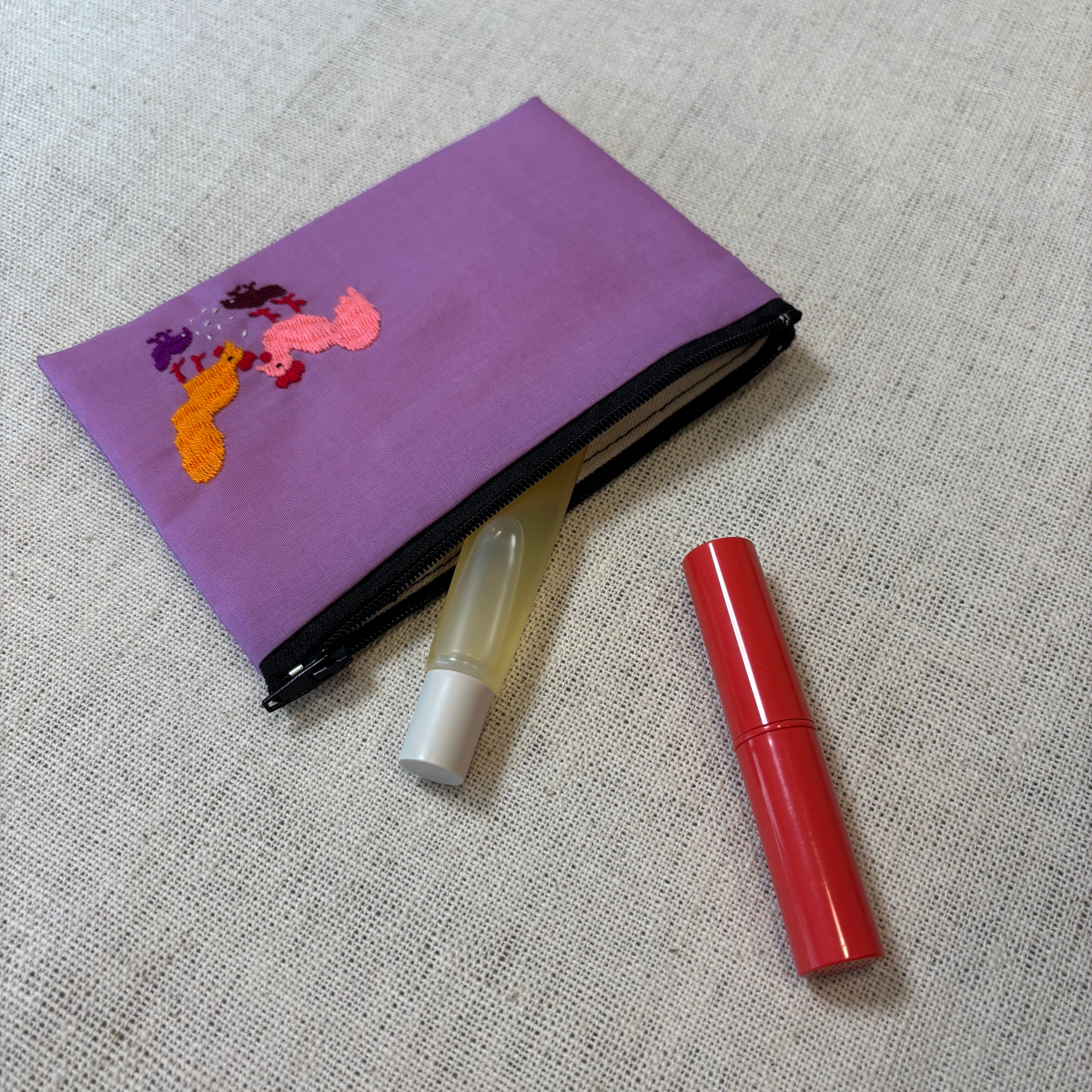 ワンポイントが映えるすっきりとしたデザインで、コスメや小物入れとして日常使いしやすい一点となっております。